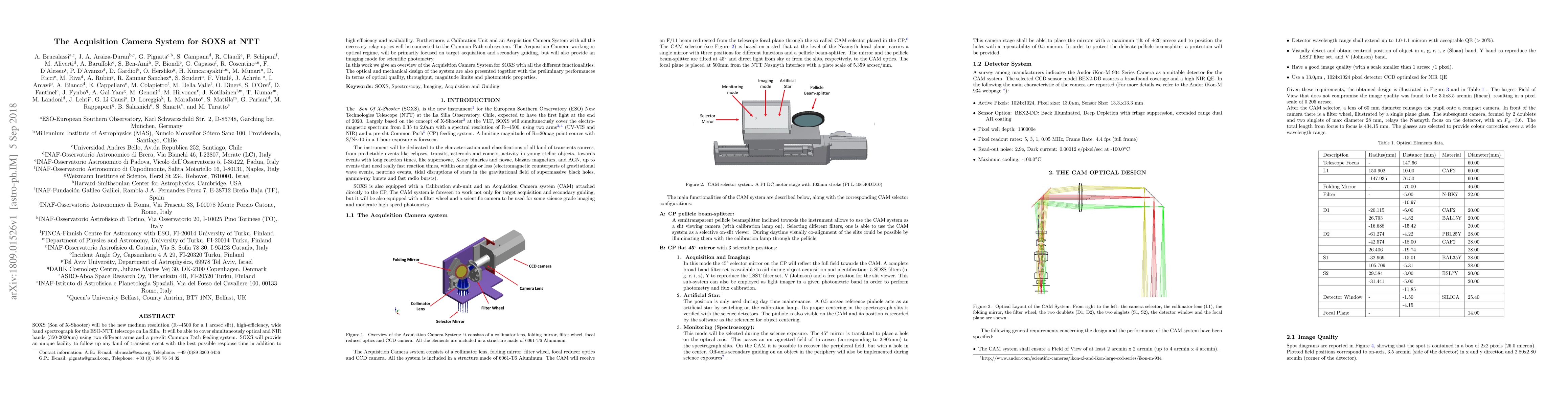 The Acquisition Camera System for SOXS, a new spectrograph for the ESO-NTT telescope, focuses on target acquisition and guiding, while also providing imaging for scientific photometry. The system's optical and mechanical design, along with preliminary performance metrics, are detailed.