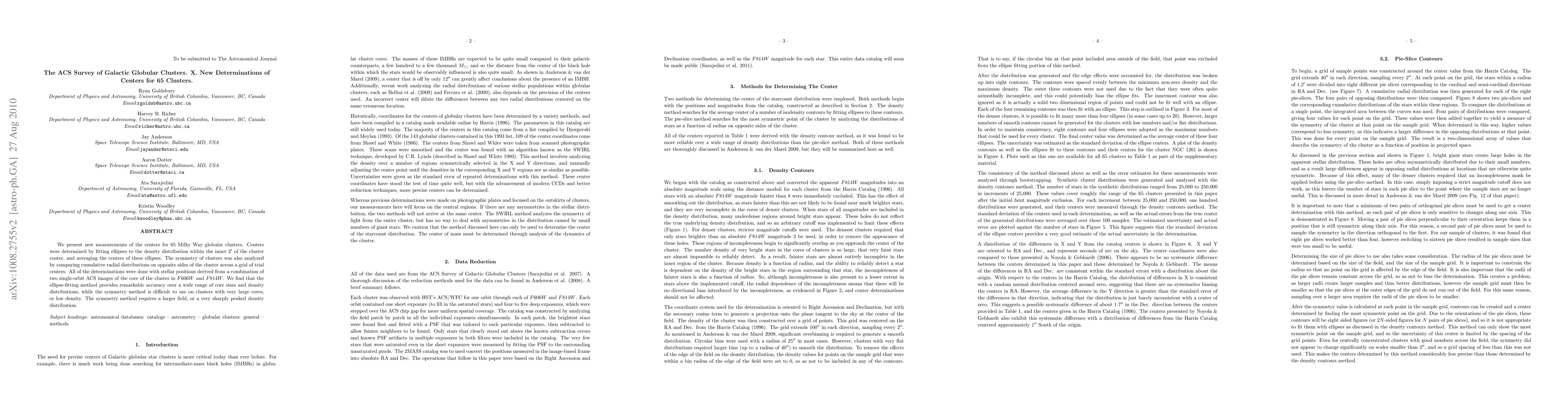 We present new measurements of the centers for 65 Milky Way globular clusters. Centers were determined by fitting ellipses to the density distribution within the inner $2\arcmin$ of the cluster center, and averaging the centers of these ellipses. The symmetry of clusters was also analyzed by comparing cumulative radial distributions on opposite sides of the cluster across a grid of trial centers. All of the determinations were done with stellar positions derived from a combination of two single-orbit ACS images of the core of the cluster in $F606W$ and $F814W$. We find that the ellipse-fitting method provides remarkable accuracy over a wide range of core sizes and density distributions, while the symmetry method is difficult to use on clusters with very large cores, or low density. The symmetry method requires a larger field, or a very sharply peaked density distribution.