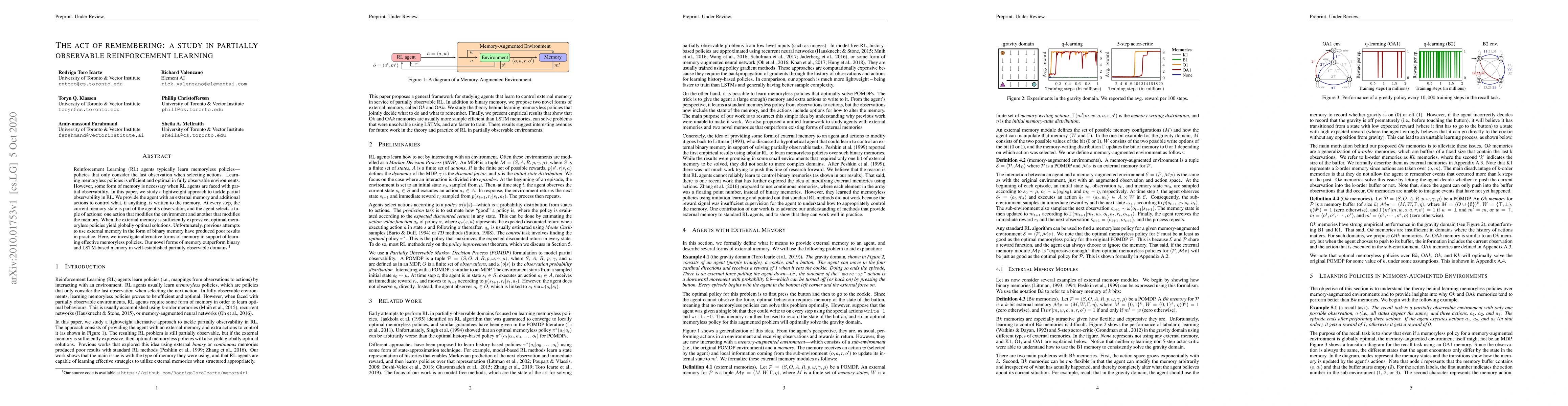 Reinforcement Learning (RL) agents typically learn memoryless policies---policies that only consider the last observation when selecting actions. Learning memoryless policies is efficient and optimal in fully observable environments. However, some form of memory is necessary when RL agents are faced with partial observability. In this paper, we study a lightweight approach to tackle partial observability in RL. We provide the agent with an external memory and additional actions to control what, if anything, is written to the memory. At every step, the current memory state is part of the agent's observation, and the agent selects a tuple of actions: one action that modifies the environment and another that modifies the memory. When the external memory is sufficiently expressive, optimal memoryless policies yield globally optimal solutions. Unfortunately, previous attempts to use external memory in the form of binary memory have produced poor results in practice. Here, we investigate alternative forms of memory in support of learning effective memoryless policies. Our novel forms of memory outperform binary and LSTM-based memory in well-established partially observable domains.