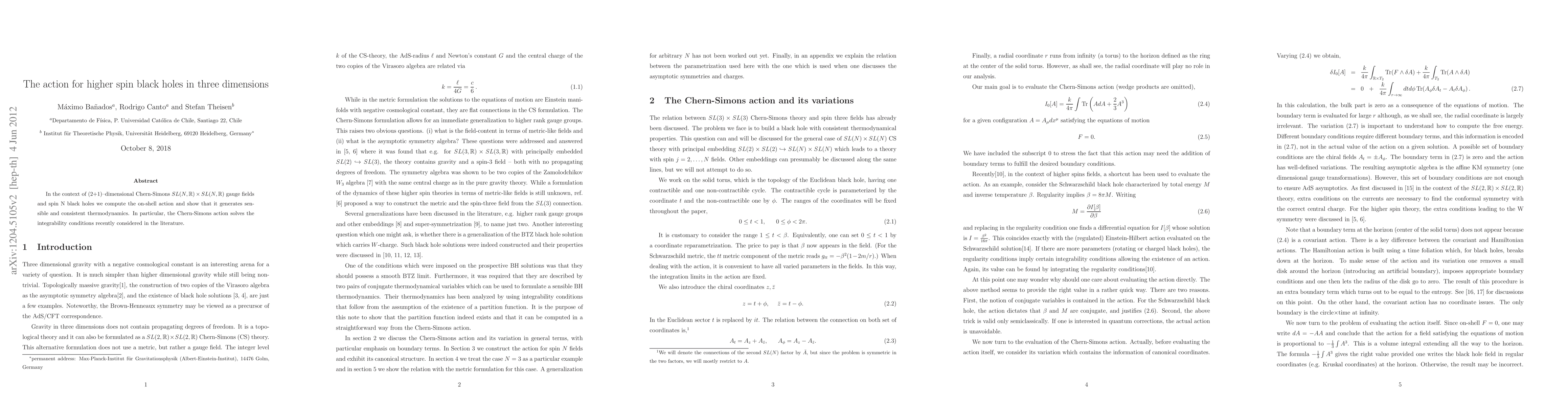 In the context of (2+1)--dimensional Chern-Simons SL(N,R)\times SL(N,R) gauge fields and spin N black holes we compute the on-shell action and show that it generates sensible and consistent thermodynamics. In particular, the Chern-Simons action solves the integrability conditions recently considered in the literature.