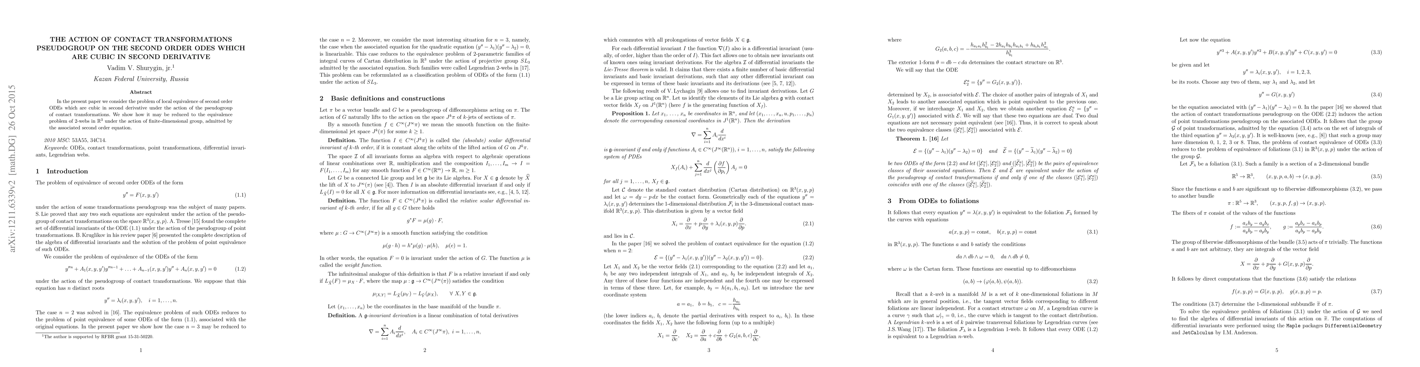 This paper investigates the local equivalence of second-order ODEs cubic in the second derivative under the action of contact transformations. It demonstrates that this problem can be reduced to the equivalence of 2-webs in $\mathbb{R}^3$ via a finite-dimensional group associated with the ODEs.