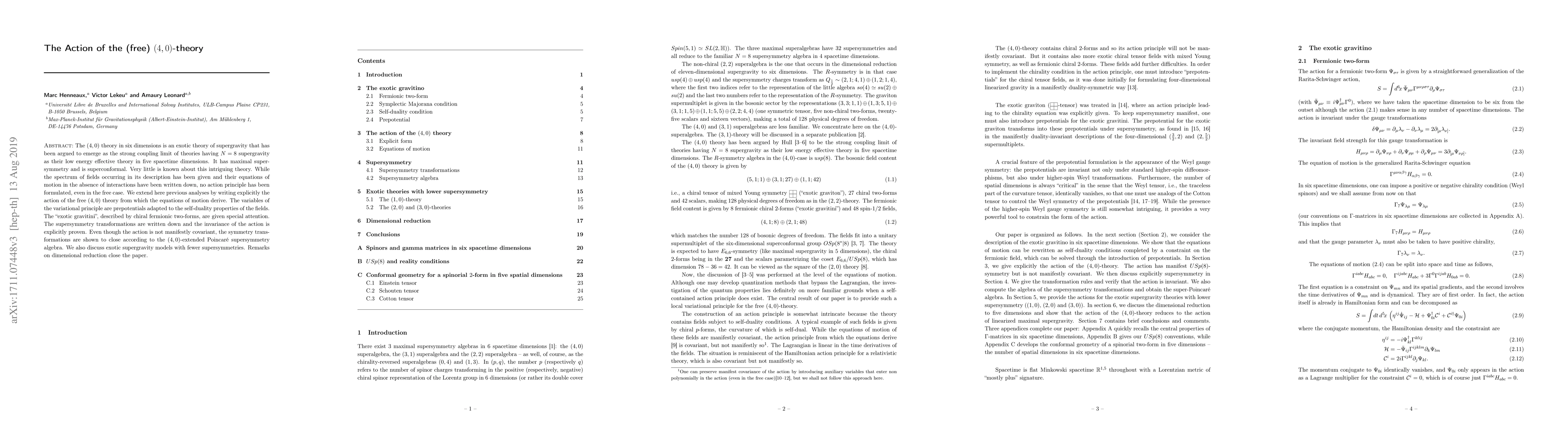 The paper formulates the action of the free (4,0) theory in six dimensions, a supergravity theory with maximal supersymmetry, and demonstrates its invariance under symmetry transformations.