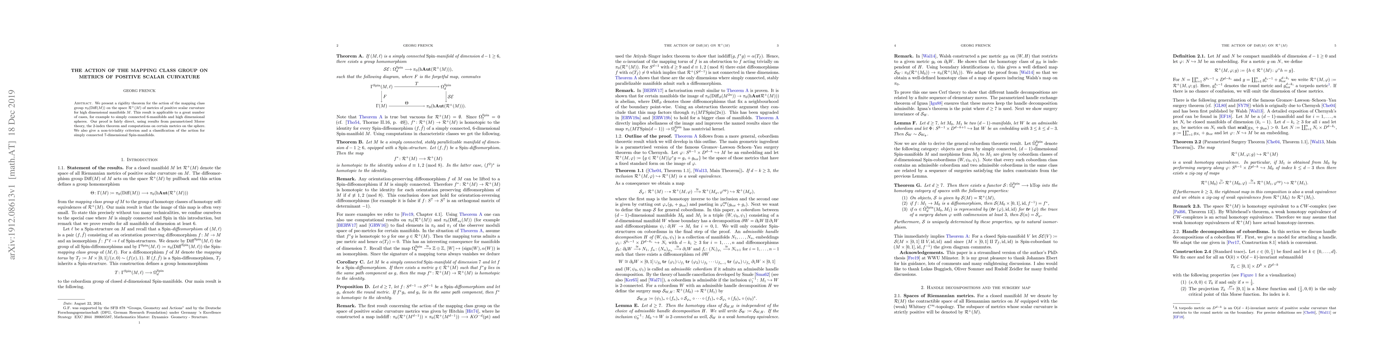 We present a rigidity theorem for the action of the mapping class group $\pi_0(\mathrm{Diff}(M))$ on the space $\mathcal{R}^+(M)$ of metrics of positive scalar curvature for high dimensional manifolds $M$. This result is applicable to a great number of cases, for example to simply connected $6$-manifolds and high dimensional spheres. Our proof is fairly direct, using results from parametrised Morse theory, the $2$-index theorem and computations on certain metrics on the sphere. We also give a non-triviality criterion and a classification of the action for simply connected $7$-dimensional $\mathrm{Spin}$-manifolds.