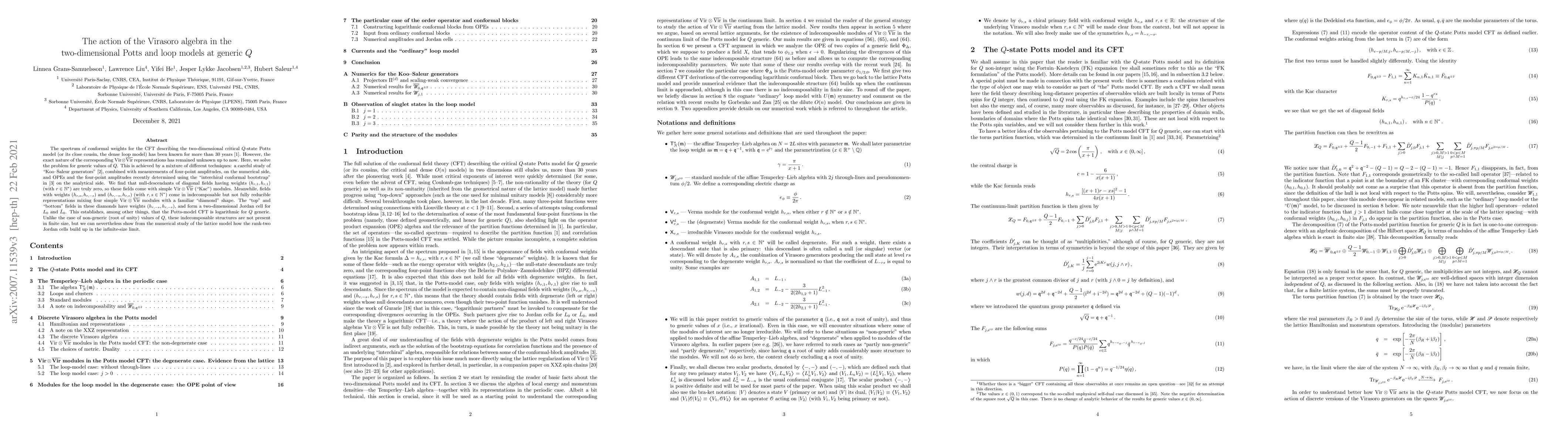 This paper resolves the nature of Virasoro algebra representations in the two-dimensional Potts and loop models for generic values of $Q$. It finds that diagonal fields yield simple modules, while other fields form indecomposable representations with a "diamond" structure, establishing the logarithmic conformal field theory (CFT) nature for generic $Q$.