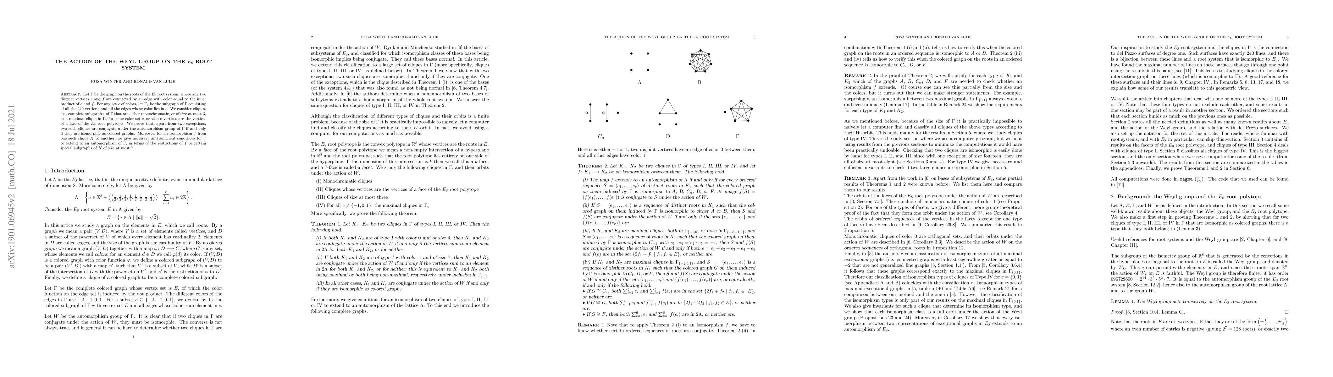 Let $\Gamma$ be the graph on the roots of the $E_8$ root system, where any two distinct vertices $e$ and $f$ are connected by an edge with color equal to the inner product of $e$ and $f$. For any set $c$ of colors, let $\Gamma_c$ be the subgraph of $\Gamma$ consisting of all the $240$ vertices, and all the edges whose color lies in $c$. We consider cliques, i.e., complete subgraphs, of $\Gamma$ that are either monochromatic, or of size at most $3$, or a maximal clique in $\Gamma_c$ for some color set $c$, or whose vertices are the vertices of a face of the $E_8$ root polytope. We prove that, apart from two exceptions, two such cliques are conjugate under the automorphism group of $\Gamma$ if and only if they are isomorphic as colored graphs. Moreover, for an isomorphism $f$ from one such clique $K$ to another, we give necessary and sufficient conditions for $f$ to extend to an automorphism of $\Gamma$, in terms of the restrictions of $f$ to certain special subgraphs of $K$ of size at most 7.