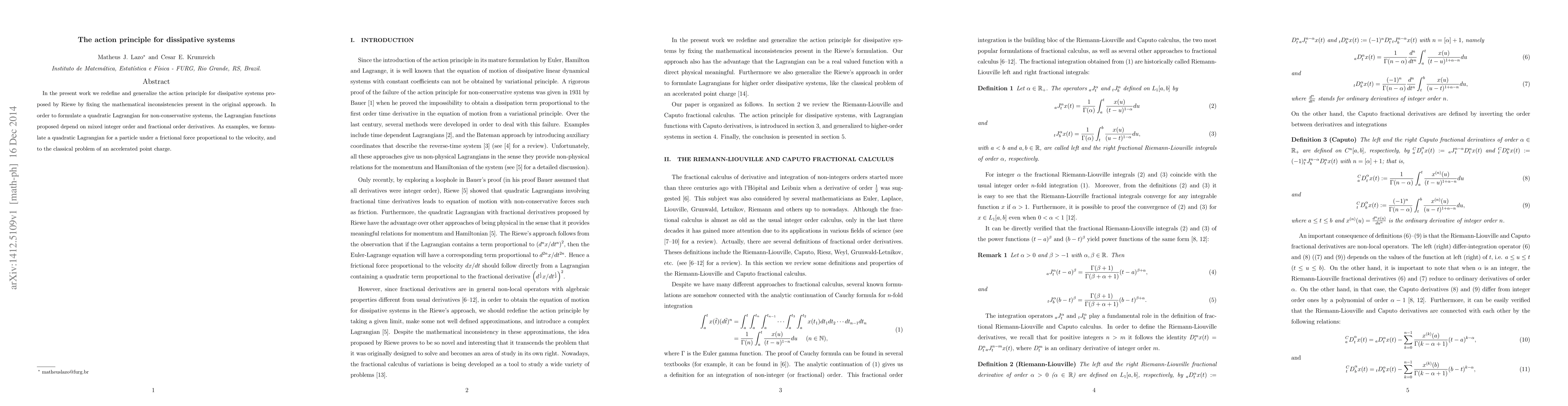 This paper corrects and extends Riewe's action principle for dissipative systems, introducing a new quadratic Lagrangian that uses mixed integer and fractional order derivatives. It applies this framework to a particle with velocity-proportional friction and an accelerated point charge.