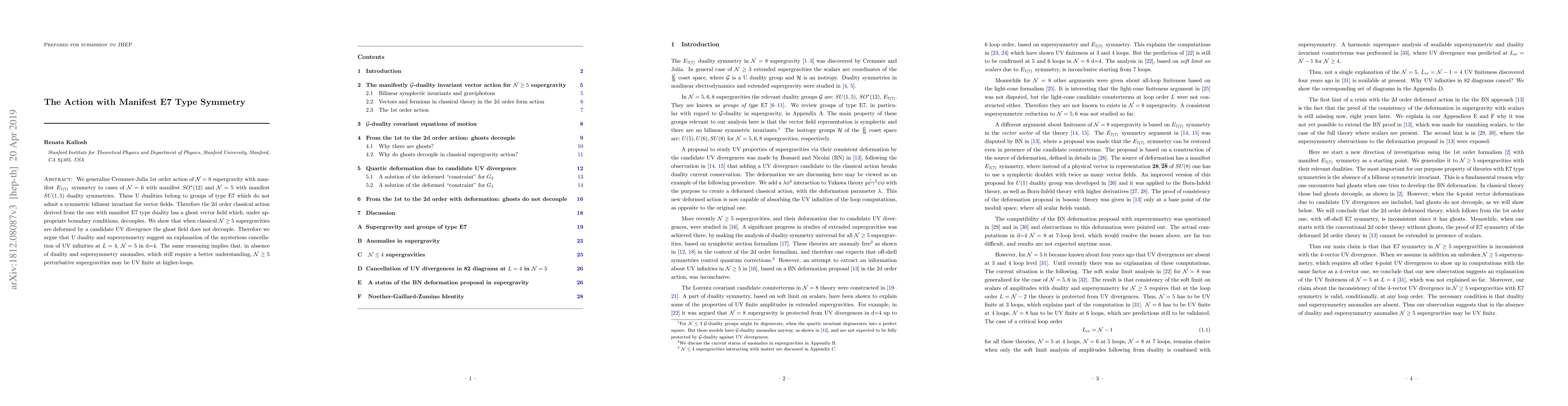 We generalize Cremmer-Julia 1st order action of $N=8$ supergravity with manifest $E_{7(7)}$ symmetry to cases of $N=6$ with manifest $SO^*(12)$ and $N=5$ with manifest $SU(1,5)$ duality symmetries. These U dualities belong to groups of type E7 which do not admit a symmetric bilinear invariant for vector fields. Therefore the 2d order classical action derived from the one with manifest E7 type duality has a ghost vector field which, under appropriate boundary conditions, decouples. We show that when classical $N\geq 5$ supergravities are deformed by a candidate UV divergence the ghost field does not decouple. Therefore we argue that U duality and supersymmetry suggest an explanation of the mysterious cancellation of UV infinities at $L=4$, $N=5$ in d=4. The same reasoning implies that, in absence of duality and supersymmetry anomalies, which still require a better understanding, $N\geq 5$ perturbative supergravities may be UV finite at higher-loops.