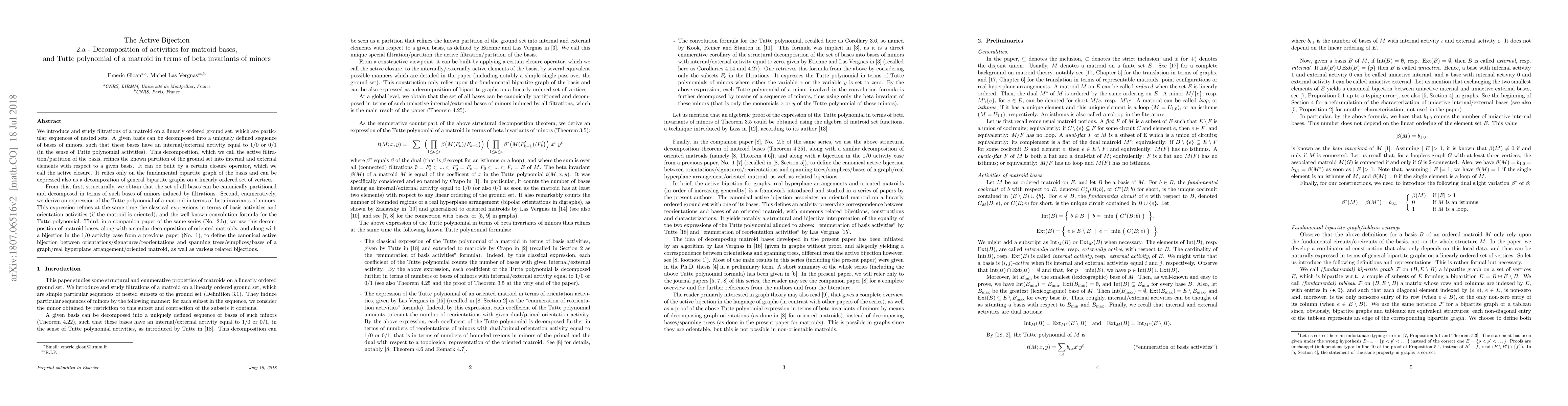 We introduce and study filtrations of a matroid on a linearly ordered ground set, which are particular sequences of nested sets. A given basis can be decomposed into a uniquely defined sequence of bases of minors, such that these bases have an internal/external activity equal to 1/0 or 0/1 (in the sense of Tutte polynomial activities). This decomposition, which we call the active filtration/partition of the basis, refines the known partition of the ground set into internal and external elements with respect to a given basis. It can be built by a certain closure operator, which we call the active closure. It relies only on the fundamental bipartite graph of the basis and can be expressed also as a decomposition of general bipartite graphs on a linearly ordered set of vertices. From this, first, structurally, we obtain that the set of all bases can be canonically partitioned and decomposed in terms of such bases of minors induced by filtrations. Second, enumeratively, we derive an expression of the Tutte polynomial of a matroid in terms of beta invariants of minors. This expression refines at the same time the classical expressions in terms of basis activities and orientation activities (if the matroid is oriented), and the well-known convolution formula for the Tutte polynomial. Third, in a companion paper of the same series (No. 2.b), we use this decomposition of matroid bases, along with a similar decomposition of oriented matroids, and along with a bijection in the 1/0 activity case from a previous paper (No. 1), to define the canonical active bijection between orientations/signatures/reorientations and spanning trees/simplices/bases of a graph/real hyperplane arrangement/oriented matroid, as well as various related bijections.