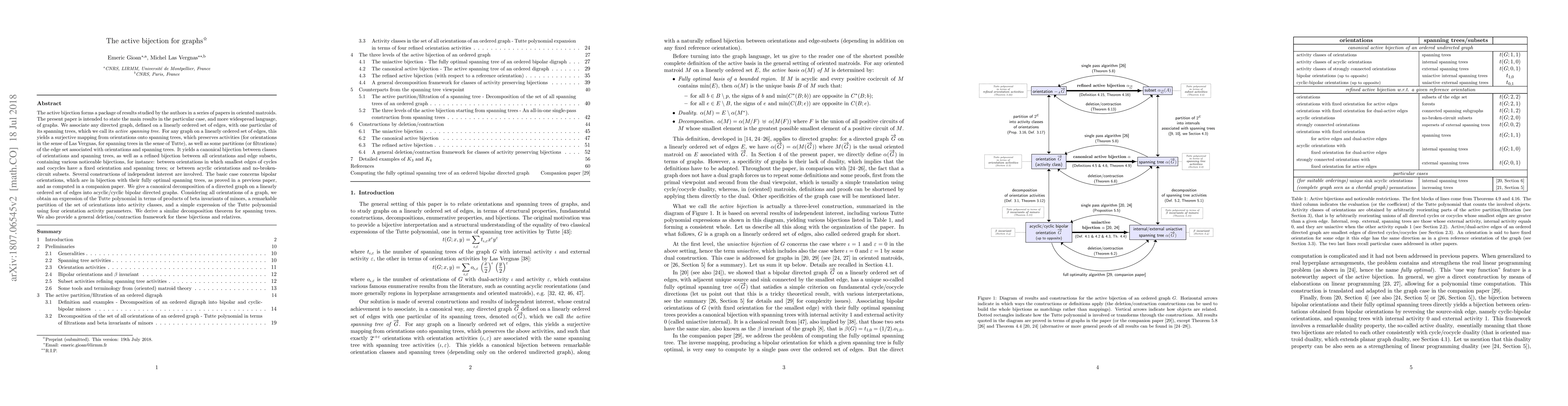 The active bijection forms a package of results studied by the authors in a series of papers in oriented matroids. The present paper is intended to state the main results in the particular case, and more widespread language, of graphs. We associate any directed graph, defined on a linearly ordered set of edges, with one particular of its spanning trees, which we call its active spanning tree. For any graph on a linearly ordered set of edges, this yields a surjective mapping from orientations onto spanning trees, which preserves activities (for orientations in the sense of Las Vergnas, for spanning trees in the sense of Tutte), as well as some partitions (or filtrations) of the edge set associated with orientations and spanning trees. It yields a canonical bijection between classes of orientations and spanning trees, as well as a refined bijection between all orientations and edge subsets, containing various noticeable bijections [...]. Several constructions of independent interest are involved. The basic case concerns bipolar orientations, which are in bijection with their fully optimal spanning trees, as proved in a previous paper, and as computed in a companion paper. We give a canonical decomposition of a directed graph on a linearly ordered set of edges into acyclic/cyclic bipolar directed graphs. Considering all orientations of a graph, we obtain an expression of the Tutte polynomial in terms of products of beta invariants of minors, a remarkable partition of the set of orientations into activity classes, and a simple expression of the Tutte polynomial using four orientation activity parameters. We derive a similar decomposition theorem for spanning trees. We also provide a general deletion/contraction framework for these bijections and relatives.