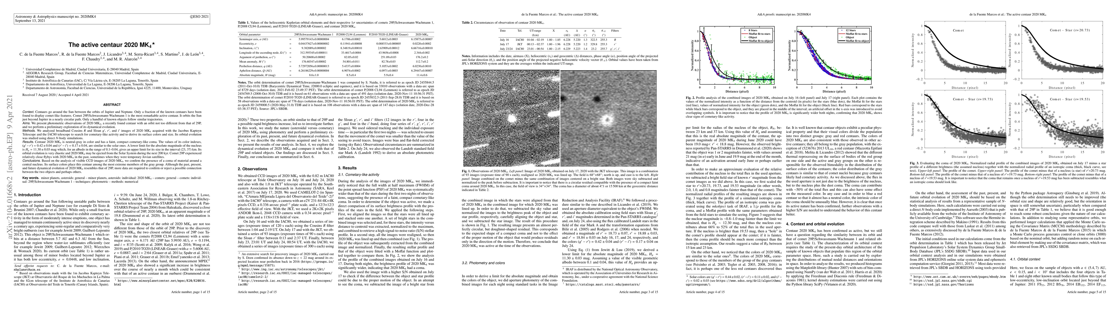 Context. Centaurs go around the Sun between the orbits of Jupiter and Neptune. Only a fraction of the known centaurs have been found to display comet-like features. Comet 29P/Schwassmann-Wachmann 1 is the most remarkable active centaur. It orbits the Sun just beyond Jupiter in a nearly circular path. Only a handful of known objects follow similar trajectories. Aims. We present photometric observations of 2020 MK4, a recently found centaur with an orbit not too different from that of 29P, and we perform a preliminary exploration of its dynamical evolution. Methods. We analyzed broadband Cousins R and Sloan g', r', and i' images of 2020 MK4 acquired with the Jacobus Kapteyn Telescope and the IAC80 telescope to search for cometary-like activity, and to derive its surface colors and size. Its orbital evolution was studied using direct N-body simulations. Results. Centaur 2020 MK4 is neutral-gray in color and has a faint, compact cometary-like coma. The values of its color indexes, (g'-r')=0.42+/-0.04 and (r'-i')=0.17+/-0.04, are similar to the solar ones. A lower limit for the absolute magnitude of the nucleus is Hg=11.30+/-0.03 mag which, for an albedo in the range of 0.1-0.04, gives an upper limit for its size in the interval (23, 37) km. Its orbital evolution is very chaotic and 2020 MK4 may be ejected from the Solar System during the next 200 kyr. Comet 29P experienced relatively close flybys with 2020 MK4 in the past, sometimes when they were temporary Jovian satellites. Conclusions. We confirm the presence of a coma of material around a central nucleus. Its surface colors place this centaur among the most extreme members of the gray group. Although its past, present, and future dynamical evolution resembles that of 29P, more data are required to confirm or reject a possible connection between the two objects and perhaps others.