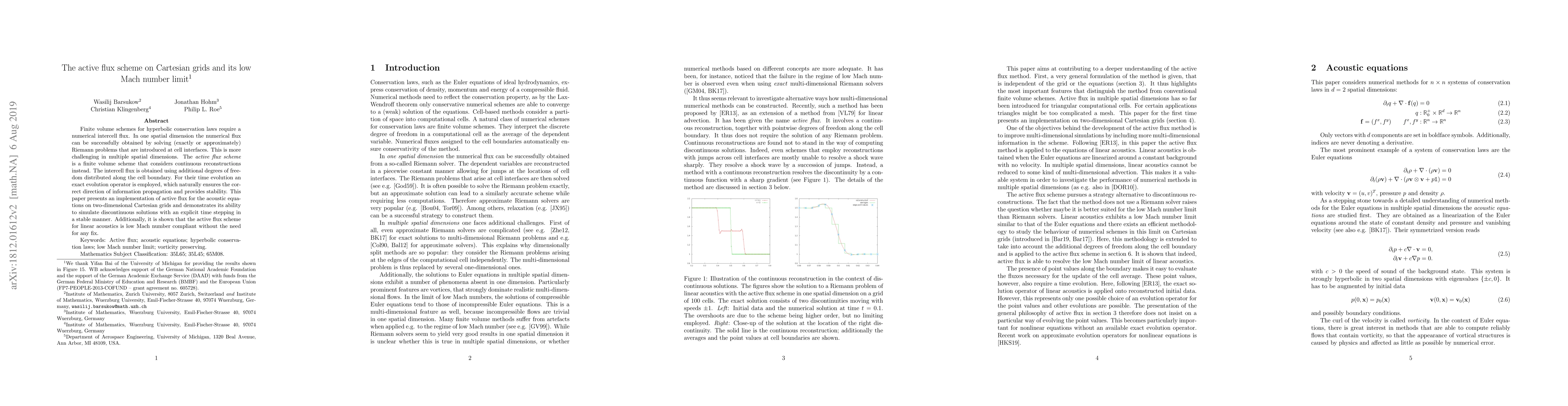 The active flux scheme is a stable finite volume method for simulating hyperbolic conservation laws on Cartesian grids without Riemann problems, and it can handle discontinuous solutions with explicit time stepping at low Mach numbers.