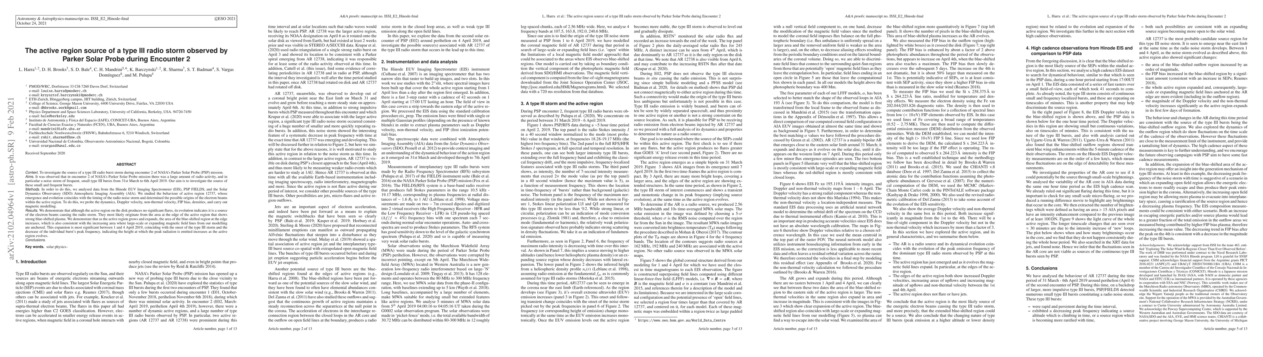 Context. To investigate the source of a type III radio burst storm during encounter 2 of NASA's Parker Solar Probe (PSP) mission. Aims. It was observed that in encounter 2 of NASA's Parker Solar Probe mission there was a large amount of radio activity, and in particular a noise storm of frequent, small type III bursts from 31st March to 6th April 2019. Our aim is to investigate the source of these small and frequent bursts. Methods. In order to do this, we analysed data from the Hinode EUV Imaging Spectrometer (EIS), PSP FIELDS, and the Solar Dynamics Observatory (SDO) Atmospheric Imaging Assembly (AIA). We studied the behaviour of active region 12737, whose emergence and evolution coincides with the timing of the radio noise storm and determined the possible origins of the electron beams within the active region. To do this, we probe the dynamics, Doppler velocity, non-thermal velocity, FIP bias, densities, and carry out magnetic modelling. Results. We demonstrate that although the active region on the disk produces no significant flares, its evolution indicates it is a source of the electron beams causing the radio storm. They most likely originate from the area at the edge of the active region that shows strong blue-shifted plasma. We demonstrate that as the active region grows and expands, the area of the blue-shifted region at the edge increases, which is also consistent with the increasing area where large-scale or expanding magnetic field lines from our modelling are anchored. This expansion is most significant between 1 and 4 April 2019, coinciding with the onset of the type III storm and the decrease of the individual burst's peak frequency, indicating the height at which the peak radiation is emitted increases as the active region evolves.