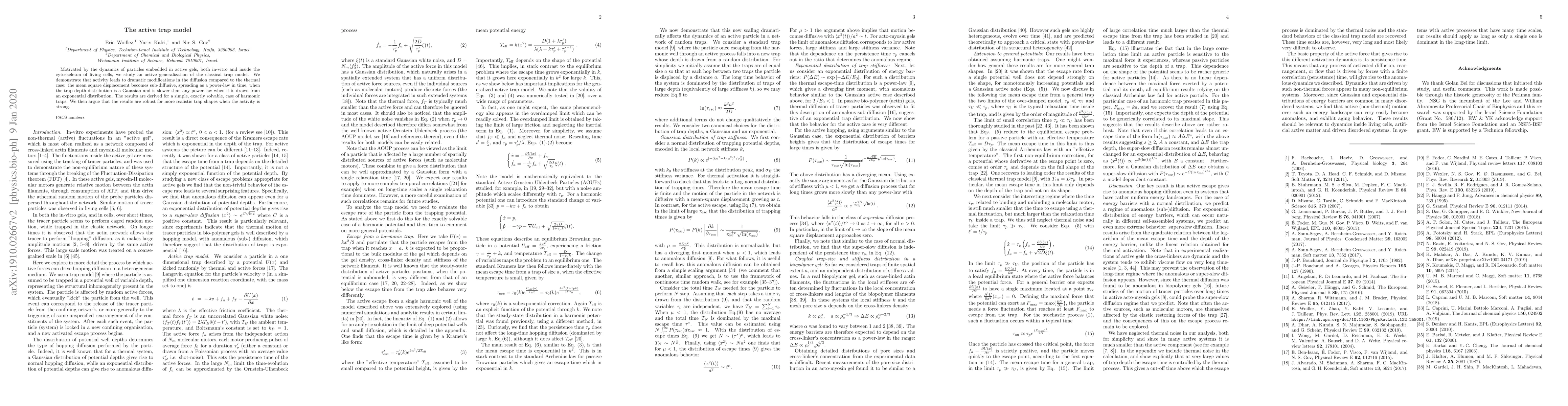 The active trap model reveals that active particles in gels and cytoskeletons exhibit sub-diffusive behavior, with mean square displacement following a power-law in time, contrasting with thermal diffusion dynamics. The findings, derived from a simple harmonic trap model, suggest robustness for stronger activity in more complex trap shapes.