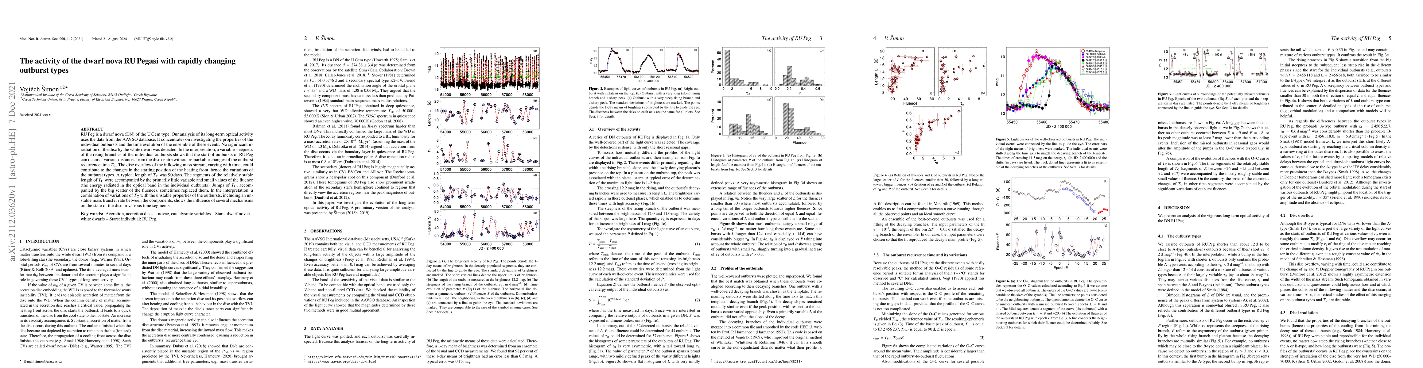 RU Peg is a dwarf nova (DN) of the U Gem type. Our analysis of its long-term optical activity uses the data from the AAVSO database. It concentrates on investigating the properties of the individual outbursts and the time evolution of the ensemble of these events. No significant irradiation of the disc by the white dwarf was detected. In the interpretation, a variable steepness of the rising branches of the individual outbursts shows that the start of outbursts of RU Peg can occur at various distances from the disc centre without remarkable changes of the outburst recurrence time $T_{\rm C}$. The disc overflow of the inflowing mass stream, varying with time, could contribute to the changes in the starting position of the heating front, hence the variations of the outburst types. A typical length of $T_{\rm C}$ was 90 days. The segments of the relatively stable length of $T_{\rm C}$ were accompanied by the primarily little variable and small values of the fluence (the energy radiated in the optical band in the individual outbursts). Jumps of $T_{\rm C}$, accompanied by the big scatter of the fluences, sometimes replaced them. In the interpretation, a combination of variations of $T_{\rm C}$ with the unstable properties of the outbursts, including an unstable mass transfer rate between the components, shows the influence of several mechanisms on the state of the disc in various time segments.