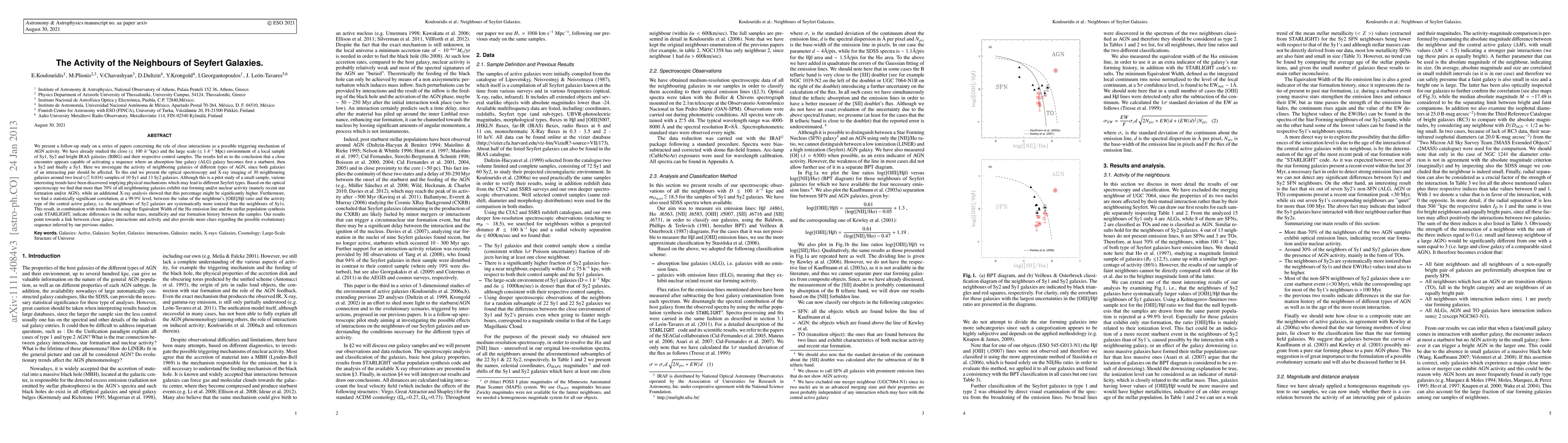 We present a follow-up study on a series of papers concerning the role of close interactions as a possible triggering mechanism of AGN activity. We have already studied the close (<100kpc/h) and the large scale (<1 Mpc/h) environment of a local sample of Sy1, Sy2 and bright IRAS galaxies (BIRG) and their respective control samples. The results led us to the conclusion that a close encounter appears capable of activating a sequence where an absorption line galaxy (ALG) galaxy becomes first a starburst, then a Sy2 and finally a Sy1. Here we investigate the activity of neighboring galaxies of different types of AGN, since both galaxies of an interacting pair should be affected. To this end we present the optical spectroscopy and X-ray imaging of 30 neighbouring galaxies around two local (z<0.034) samples of 10 Sy1 and 13 Sy2 galaxies. Based on the optical spectroscopy we find that more than 70% of all neighbouring galaxies exhibit star forming and/or nuclear activity (namely recent star formation and/or AGN), while an additional X-ray analysis showed that this percentage might be significantly higher. Furthermore, we find a statistically significant correlation, at a 99.9% level, between the value of the neighbour's [OIII]/H\beta ratio and the activity type of the central active galaxy, i.e. the neighbours of Sy2 galaxies are systematically more ionized than the neighbours of Sy1s. This result, in combination with trends found using the Equivalent Width of the H\alpha emission line and the stellar population synthesis code STARLIGHT, indicate differences in the stellar mass, metallicity and star formation history between the samples. Our results point towards a link between close galaxy interactions and activity and also provide more clues regarding the possible evolutionary sequence inferred by our previous studies.