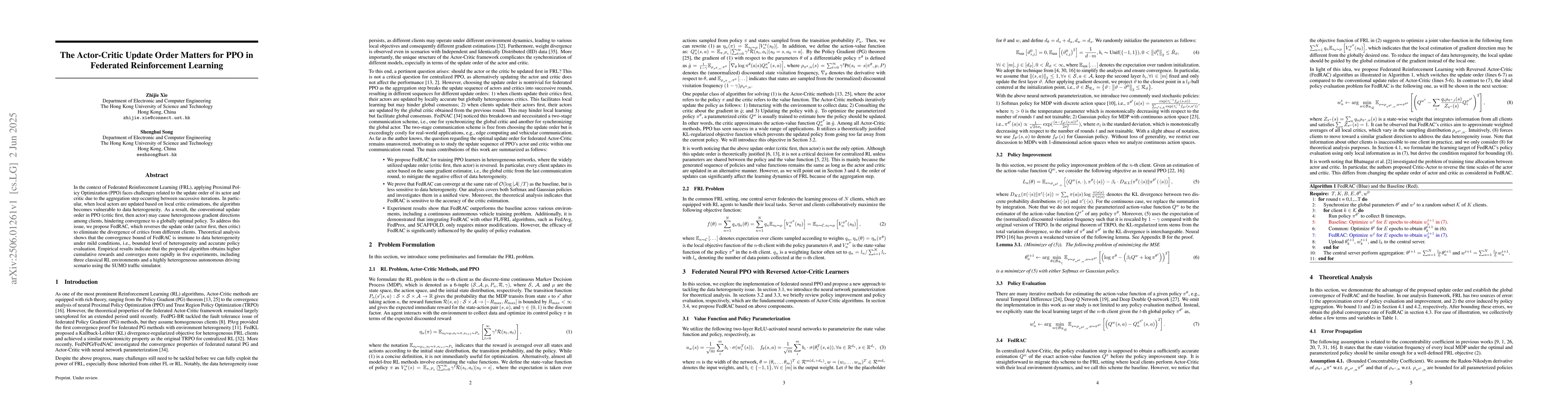 In the context of Federated Reinforcement Learning (FRL), applying Proximal Policy Optimization (PPO) faces challenges related to the update order of its actor and critic due to the aggregation step occurring between successive iterations. In particular, when local actors are updated based on local critic estimations, the algorithm becomes vulnerable to data heterogeneity. As a result, the conventional update order in PPO (critic first, then actor) may cause heterogeneous gradient directions among clients, hindering convergence to a globally optimal policy. To address this issue, we propose FedRAC, which reverses the update order (actor first, then critic) to eliminate the divergence of critics from different clients. Theoretical analysis shows that the convergence bound of FedRAC is immune to data heterogeneity under mild conditions, i.e., bounded level of heterogeneity and accurate policy evaluation. Empirical results indicate that the proposed algorithm obtains higher cumulative rewards and converges more rapidly in five experiments, including three classical RL environments and a highly heterogeneous autonomous driving scenario using the SUMO traffic simulator.
