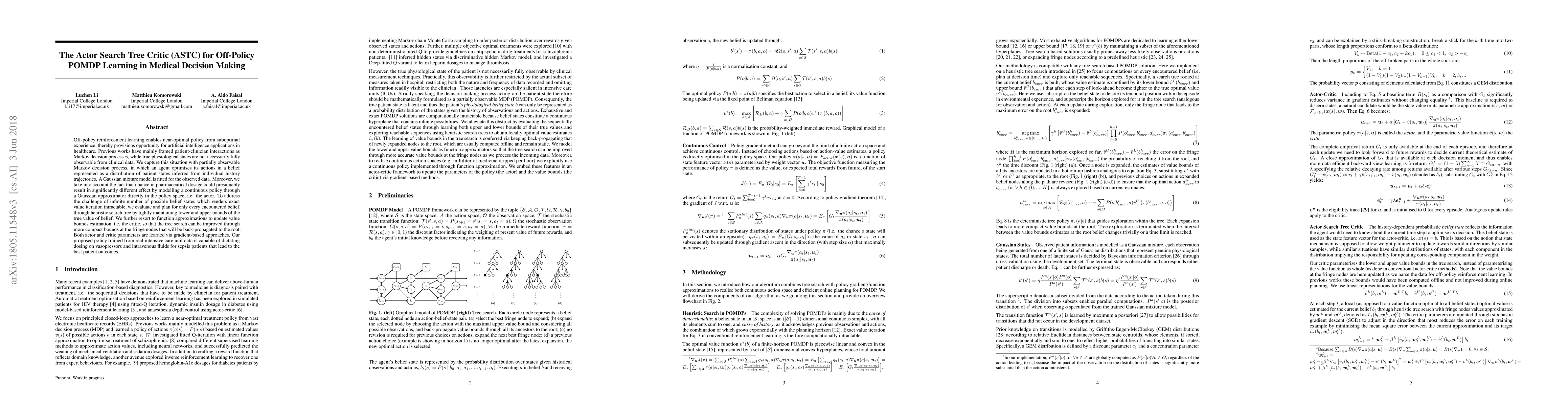 This research paper proposes a new method for using artificial intelligence in medical decision making, enabling doctors to make informed decisions based on real patient data without requiring access to the patient's internal state. The approach uses off-policy reinforcement learning and a search tree critic to optimize treatment plans for patients with sepsis.