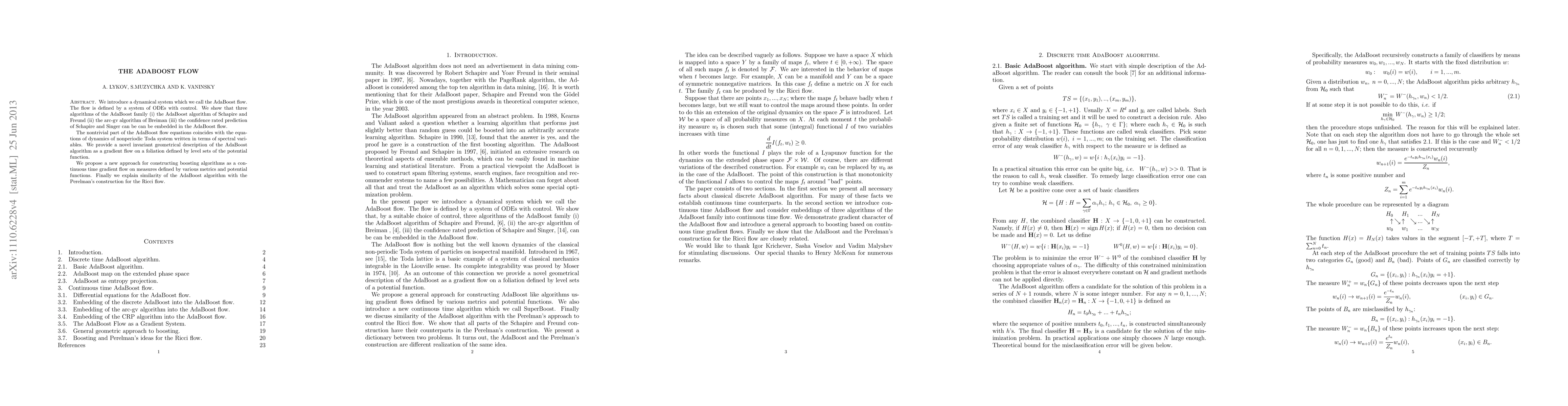 We introduce a dynamical system which we call the AdaBoost flow. The flow is defined by a system of ODEs with control. We show that three algorithms of the AdaBoost family (i) the AdaBoost algorithm of Schapire and Freund (ii) the arc-gv algorithm of Breiman (iii) the confidence rated prediction of Schapire and Singer can be can be embedded in the AdaBoost flow. The nontrivial part of the AdaBoost flow equations coincides with the equations of dynamics of nonperiodic Toda system written in terms of spectral variables. We provide a novel invariant geometrical description of the AdaBoost algorithm as a gradient flow on a foliation defined by level sets of the potential function. We propose a new approach for constructing boosting algorithms as a continuous time gradient flow on measures defined by various metrics and potential functions. Finally we explain similarity of the AdaBoost algorithm with the Perelman's construction for the Ricci flow.