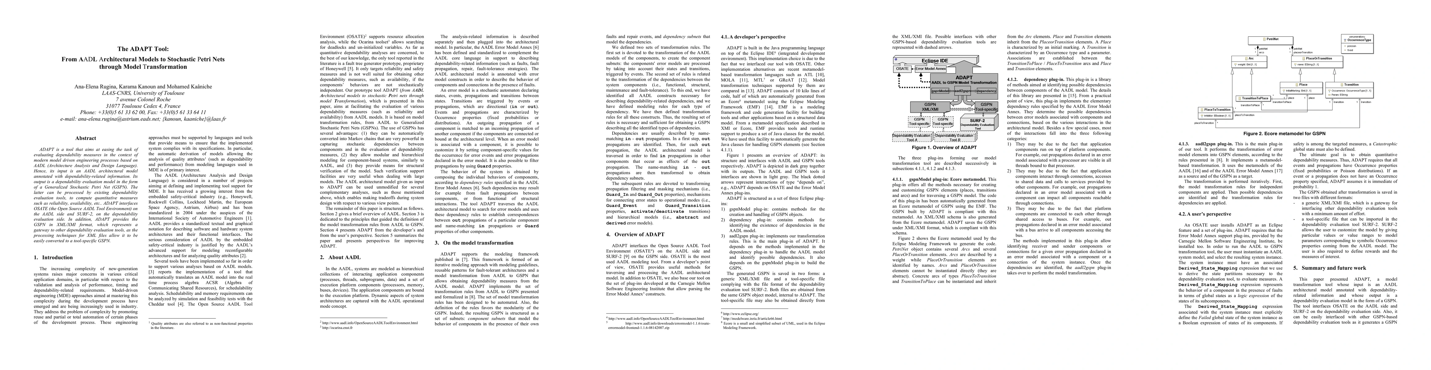 ADAPT is a tool that transforms AADL architectural models into Generalized Stochastic Petri Nets (GSPN) for dependability evaluation, interfacing with OSATE and SURF-2, and facilitating integration with other evaluation tools via XML/XMI format. It enables the computation of quantitative dependability measures like reliability and availability.