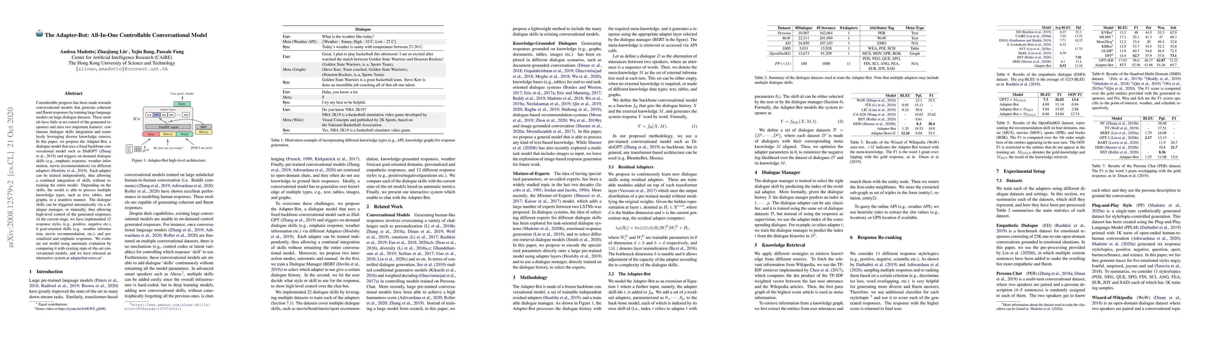 The Adapter-Bot is an all-in-one controllable conversational model that enhances existing dialogue models by integrating on-demand dialogue skills via independent adapters. It allows for flexible, continual skill integration without retraining the entire model, enabling seamless processing of diverse knowledge sources.
