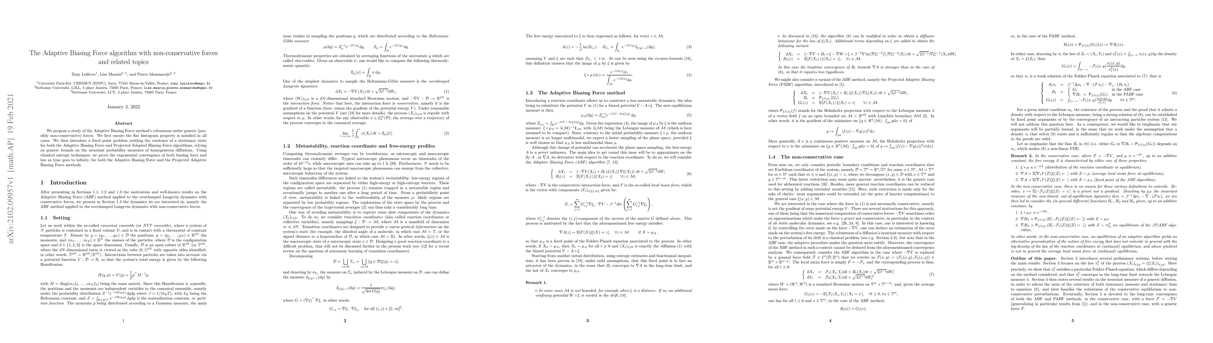 This paper investigates the robustness of the Adaptive Biasing Force (ABF) method under non-conservative forces, ensuring the flat histogram property. It proves the existence of a stationary state and demonstrates exponential convergence of both biasing force and law for ABF and its projected variant, leveraging entropy techniques.