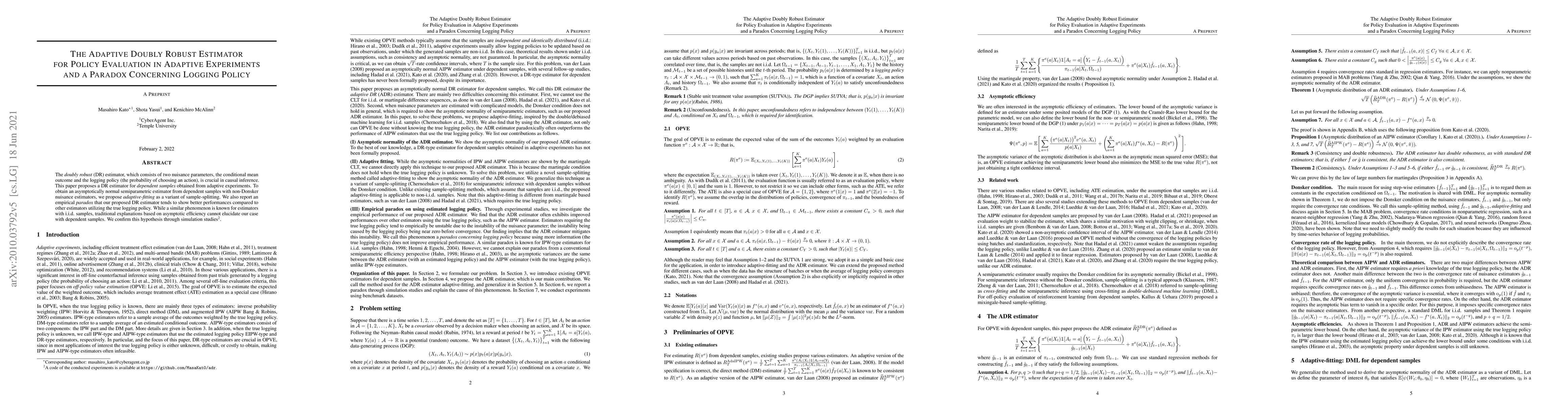 This paper proposes an adaptive doubly robust estimator for policy evaluation in adaptive experiments, utilizing adaptive-fitting to handle dependent samples. The authors also highlight an unexpected paradox where their estimator outperforms others despite not using the true logging policy, challenging traditional efficiency explanations.