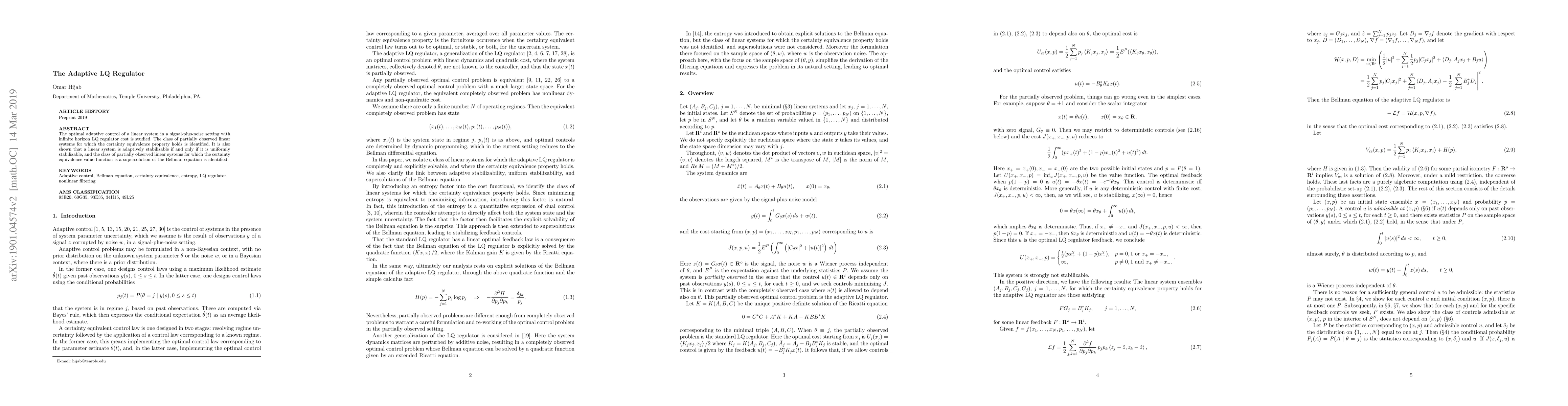 This paper investigates the optimal adaptive control of linear systems in a signal-plus-noise environment using an infinite horizon LQ regulator cost. It identifies classes of partially observed linear systems where certainty equivalence holds and proves that adaptive stabilizability is equivalent to uniform stabilizability.
