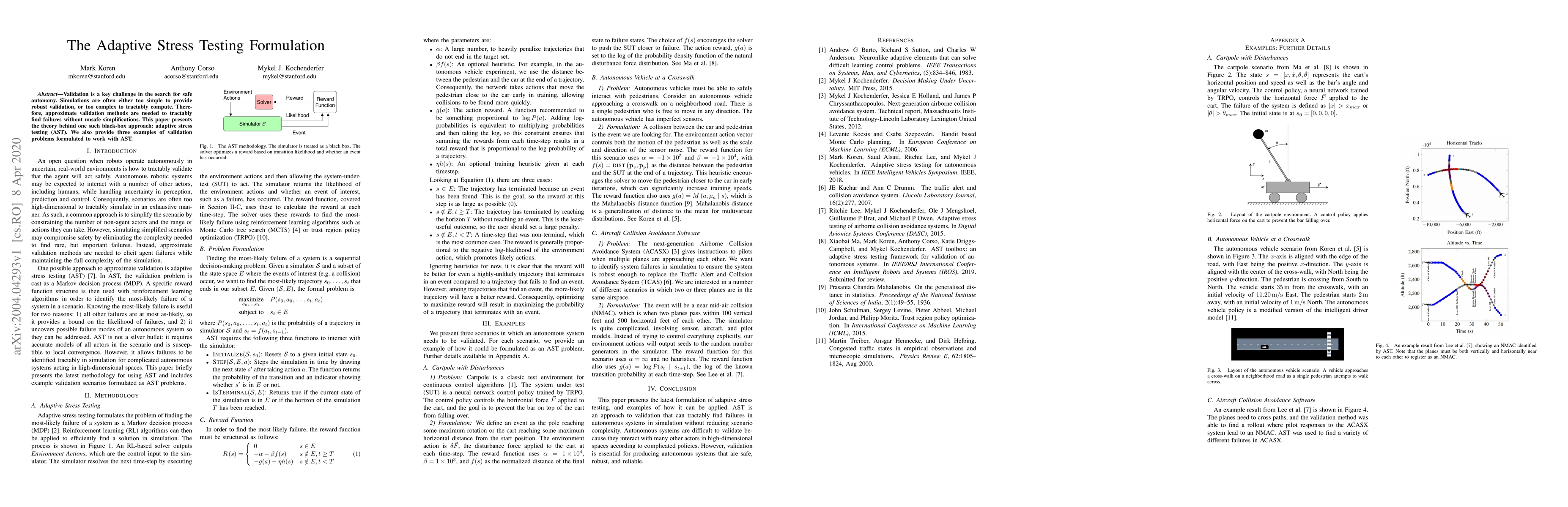 Validation is a key challenge in the search for safe autonomy. Simulations are often either too simple to provide robust validation, or too complex to tractably compute. Therefore, approximate validation methods are needed to tractably find failures without unsafe simplifications. This paper presents the theory behind one such black-box approach: adaptive stress testing (AST). We also provide three examples of validation problems formulated to work with AST.