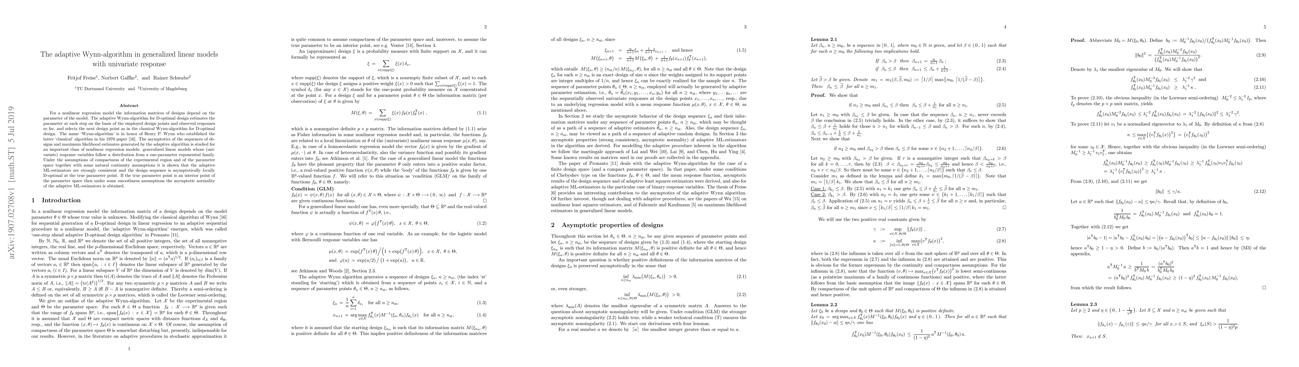The adaptive Wynn-algorithm estimates parameters iteratively in generalized linear models, ensuring design optimality and strong consistency of maximum likelihood estimates. Under certain conditions, it also achieves asymptotic normality for interior parameter points.