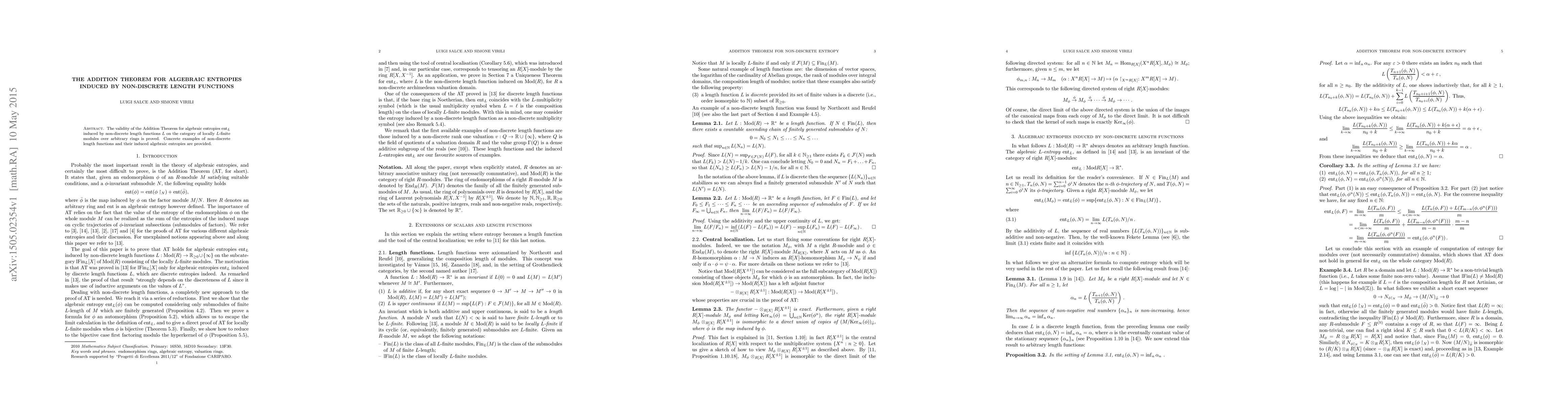 The validity of the Addition Theorem for algebraic entropies $\ent_L$ induced by non-discrete length functions $L$ on the category of locally $L$-finite modules over arbitrary rings is proved. Concrete examples of non-discrete length functions and their induced algebraic entropies are provided.