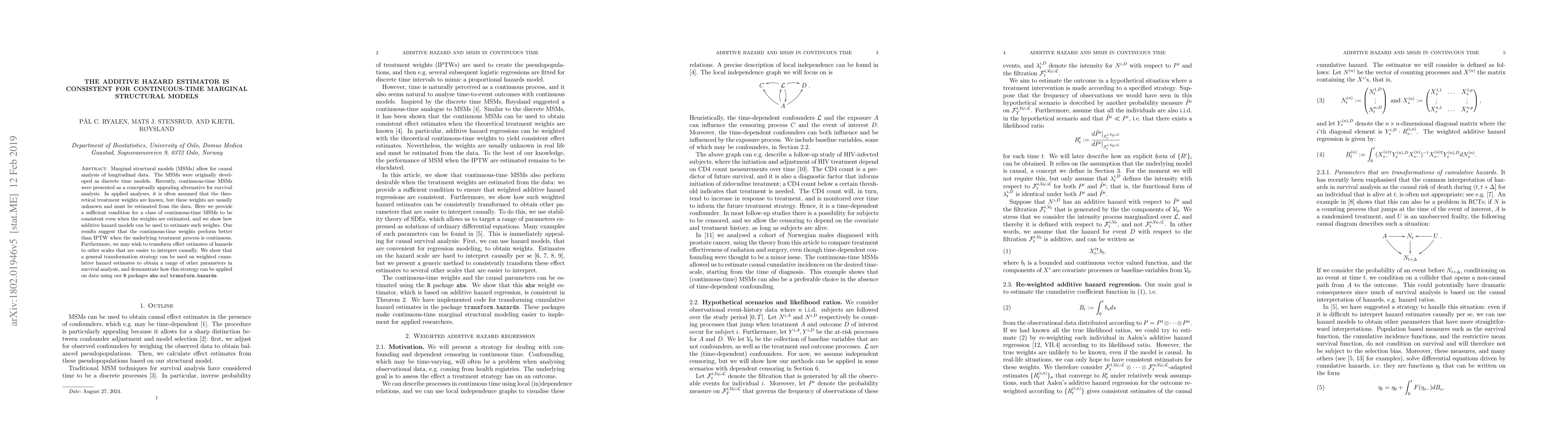 Marginal structural models (MSMs) allow for causal analysis of longitudinal data. The MSMs were originally developed as discrete time models. Recently, continuous-time MSMs were presented as a conceptually appealing alternative for survival analysis. In applied analyses, it is often assumed that the theoretical treatment weights are known, but these weights are usually unknown and must be estimated from the data. Here we provide a sufficient condition for a class of continuous-time MSMs to be consistent even when the weights are estimated, and we show how additive hazard models can be used to estimate such weights. Our results suggest that the continuous-time weights perform better than IPTW when the underlying treatment process is continuous. Furthermore, we may wish to transform effect estimates of hazards to other scales that are easier to interpret causally. We show that a general transformation strategy can be used on weighted cumulative hazard estimates to obtain a range of other parameters in survival analysis, and demonstrate how this strategy can be applied on data using our R packages ahw and transform.hazards.