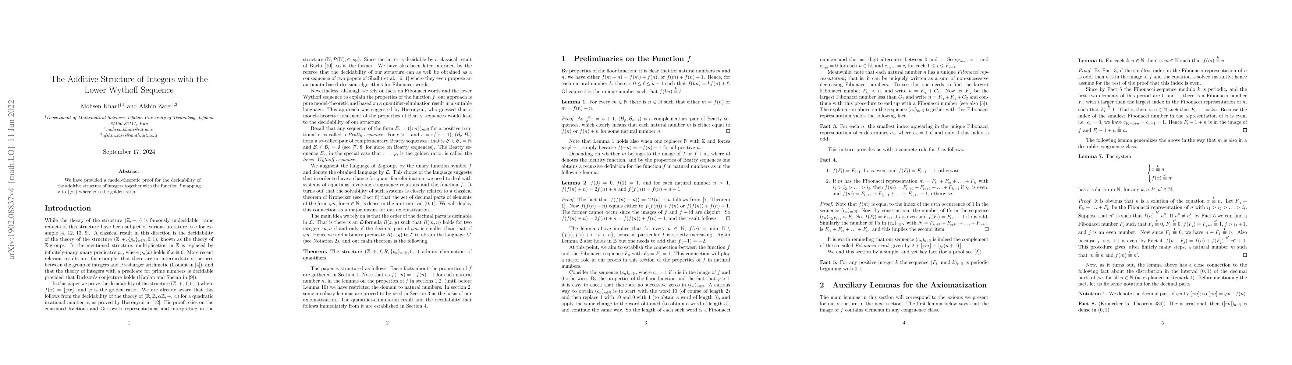 This paper presents a model-theoretic proof for the decidability of the additive structure of integers combined with a function mapping each integer to its fractional part scaled by the golden ratio. The focus is on the lower Wythoff sequence and its implications for integer addition.