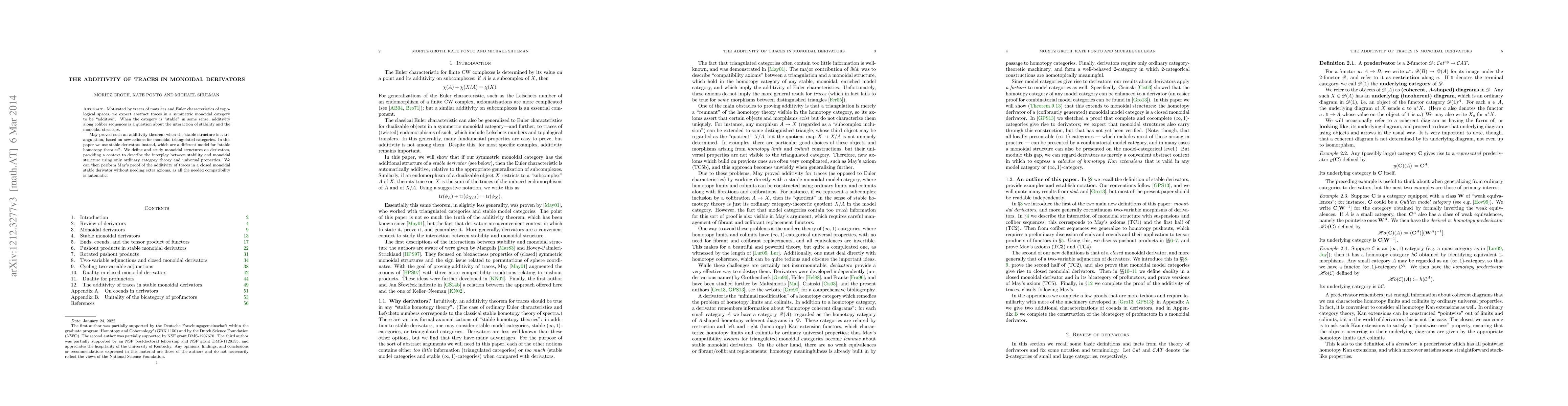 This paper explores the additivity of traces in symmetric monoidal categories, focusing on stable derivators as an alternative model for stable homotopy theories. It defines monoidal structures on derivators to describe the interaction between stability and monoidal structure using universal properties, allowing for May's additivity theorem to be proven without extra axioms.