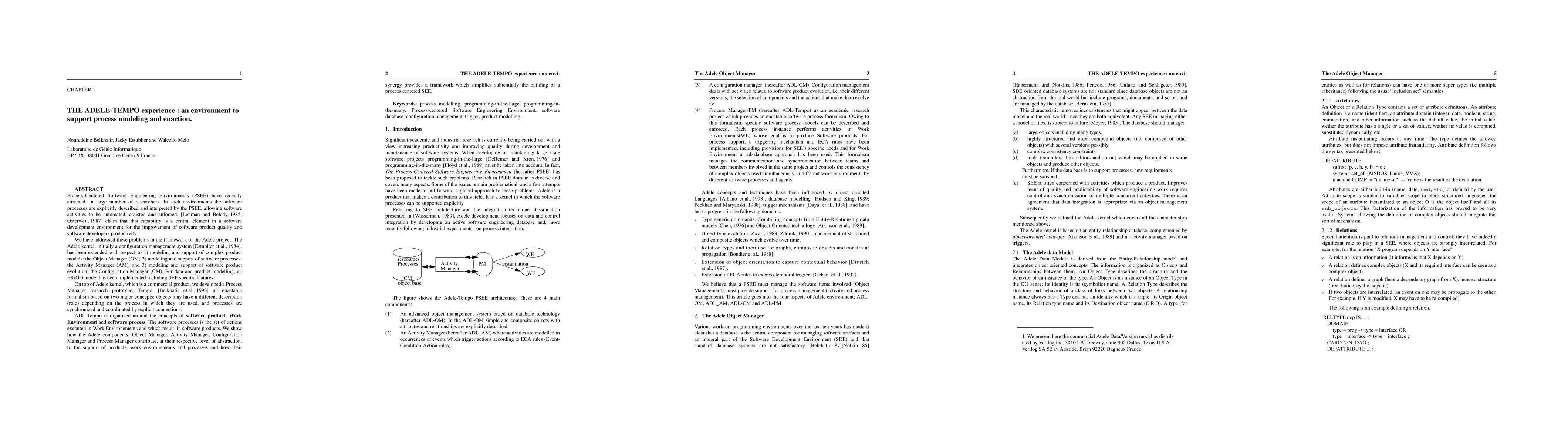 Process-Centered Software Engineering Environments (PSEE) have recently attracted a large number of researchers. In such environments the software processes are explicitly described and interpreted by the PSEE, allowing software activities to be automated, assisted, and enforced. Lehman and Belady (1985) & Osterweil (1987) claim that this capability is a central element in a software development environment for the improvement of software product quality and software developers productivity. We have addressed these problems in the framework of the Adele project. The Adele kernel, initially a configuration management system has been extended with respect to 1) modeling and support of complex product models: the Object Manager 2) modeling and support of software processes: the Activity Manager and 3) modeling and support of software product evolution: the Configuration Manager. For data and product modelling, an ER/OO model has been implemented including SEE specific features; On top of Adele kernel, which is a commercial product, we developed a Process Manager research prototype, Tempo, an enactable formalism based on two major concepts: objects may have a different description (role) depending on the process in which they are used, and processes are synchronized and coordinated by explicit connections. ADL-Tempo is organized around the concepts of software product, Work Environment and software process.