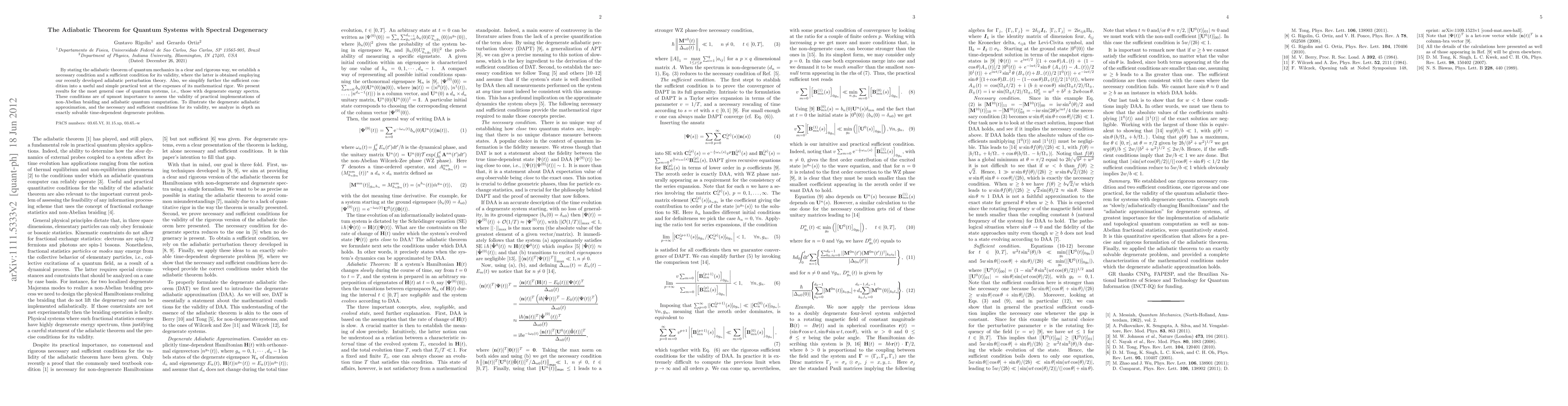 This paper rigorously formulates the adiabatic theorem for quantum systems with spectral degeneracy, presenting both necessary and sufficient conditions for its application, derived using novel adiabatic perturbation theory. It simplifies these conditions into practical tests for real-world quantum computing applications, such as non-Abelian braiding and adiabatic quantum computation.