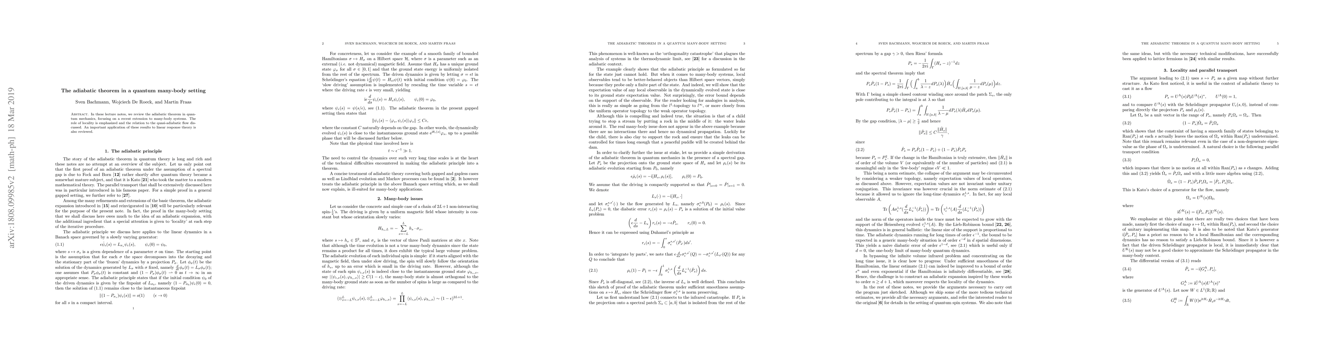 Summary: This paper reviews the adiabatic theorem in quantum mechanics, extending it to many-body systems with an emphasis on locality and quasi-adiabatic flow, and discusses its application in linear response theory.