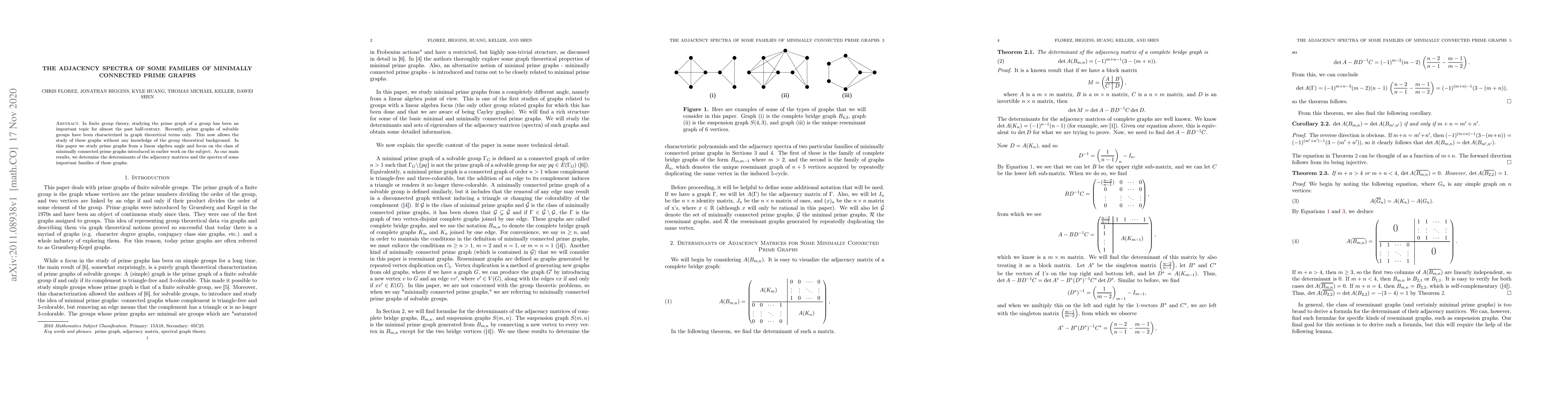 In finite group theory, studying the prime graph of a group has been an important topic for almost the past half-century. Recently, prime graphs of solvable groups have been characterized in graph theoretical terms only. This now allows the study of these graphs without any knowledge of the group theoretical background. In this paper we study prime graphs from a linear algebra angle and focus on the class of minimally connected prime graphs introduced in earlier work on the subject. As our main results, we determine the determinants of the adjacency matrices and the spectra of some important families of these graphs.