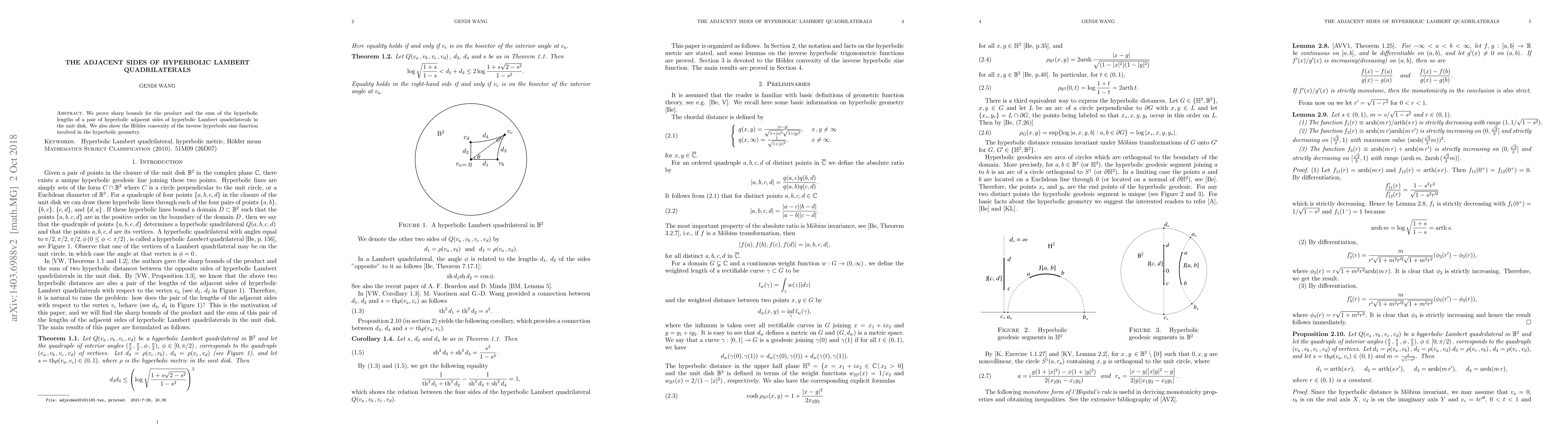 We prove sharp bounds for the product and the sum of the hyperbolic lengths of a pair of hyperbolic adjacent sides of hyperbolic Lambert quadrilaterals in the unit disk. We also show the H\"older convexity of the inverse hyperbolic sine function involved in the hyperbolic geometry.