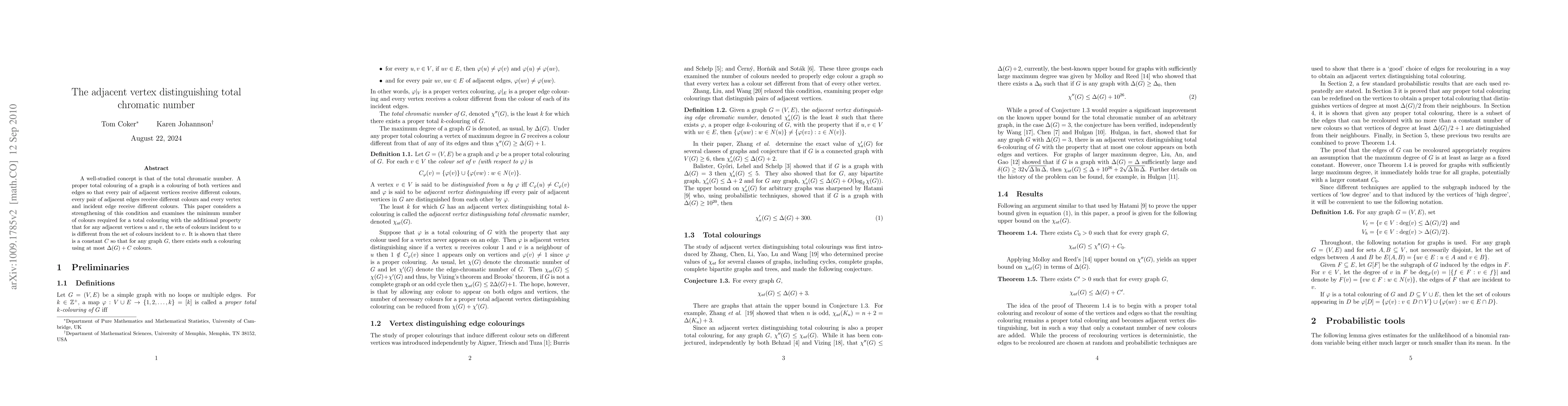 This paper investigates a strengthened version of the total chromatic number where adjacent vertices must have different sets of incident colours. It demonstrates that any graph can be coloured using at most $\Delta(G) + C$ colours, where $\Delta(G)$ is the maximum degree of the graph and $C$ is a constant.