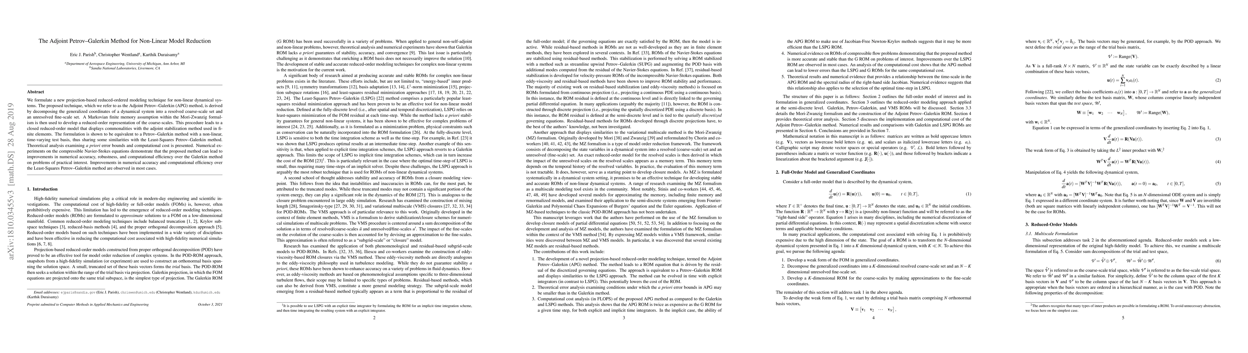 The Adjoint Petrov-Galerkin (APG) method is a new reduced-order modeling technique for non-linear dynamical systems, showing improved accuracy and efficiency over traditional methods like the Galerkin and least-squares Petrov-Galerkin methods. The method is derived using a Markovian finite memory assumption and demonstrated through numerical simulations of the compressible Navier-Stokes equations.