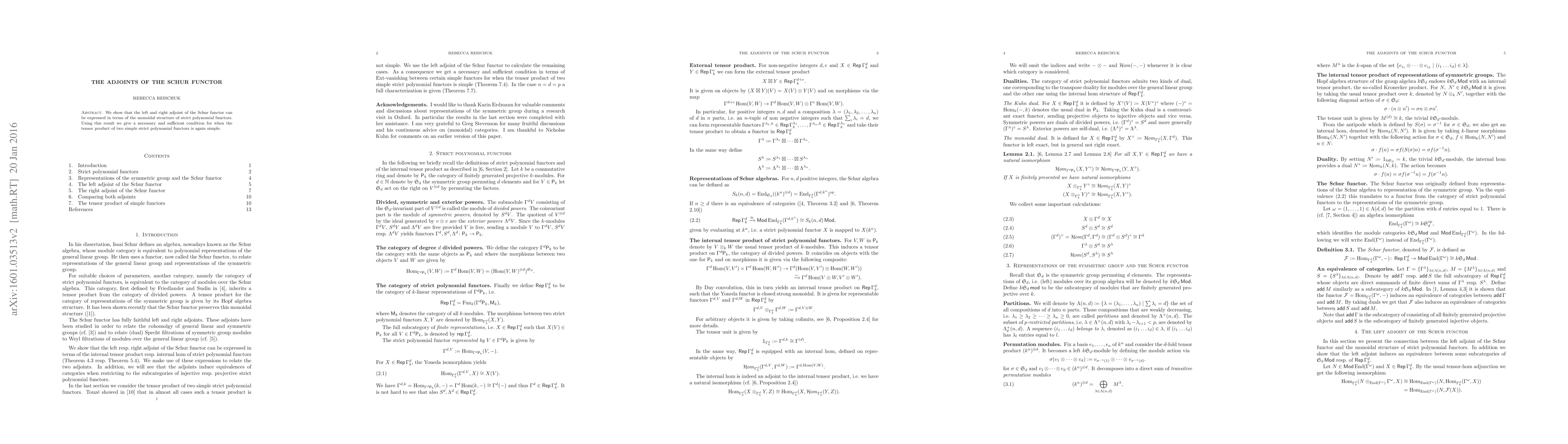We show that the left and right adjoint of the Schur functor can be expressed in terms of the monoidal structure of strict polynomial functors. Using this result we give a necessary and sufficient condition for when the tensor product of two simple strict polynomial functors is again simple.