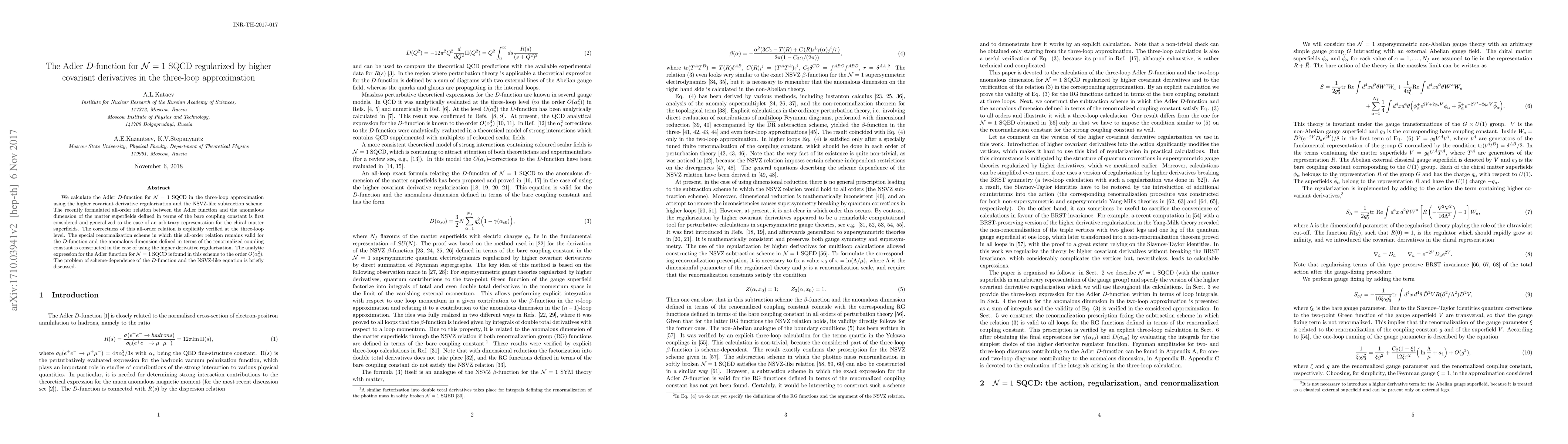 Researchers calculated the Adler $D$-function for ${ m N}=1$ SQCD in a new regularization scheme, finding an analytic expression to order $ extit{o}( extit{ extalpha}_s^2)$.