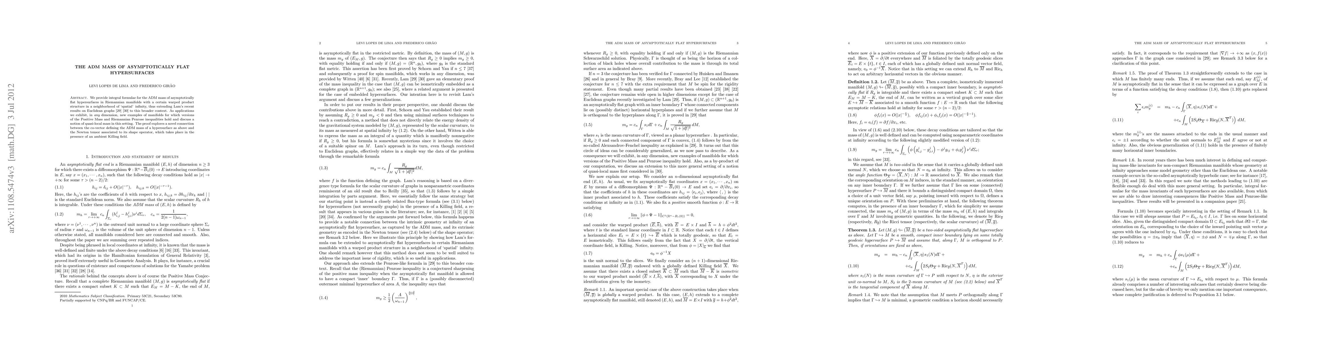 This paper extends Lam's results on ADM mass for Euclidean graphs to asymptotically flat hypersurfaces in Riemannian manifolds with a warped product structure, establishing integral formulae and exploring connections between ADM mass and the Newton tensor. Applications include new classes of manifolds satisfying Positive Mass and Riemannian Penrose inequalities.