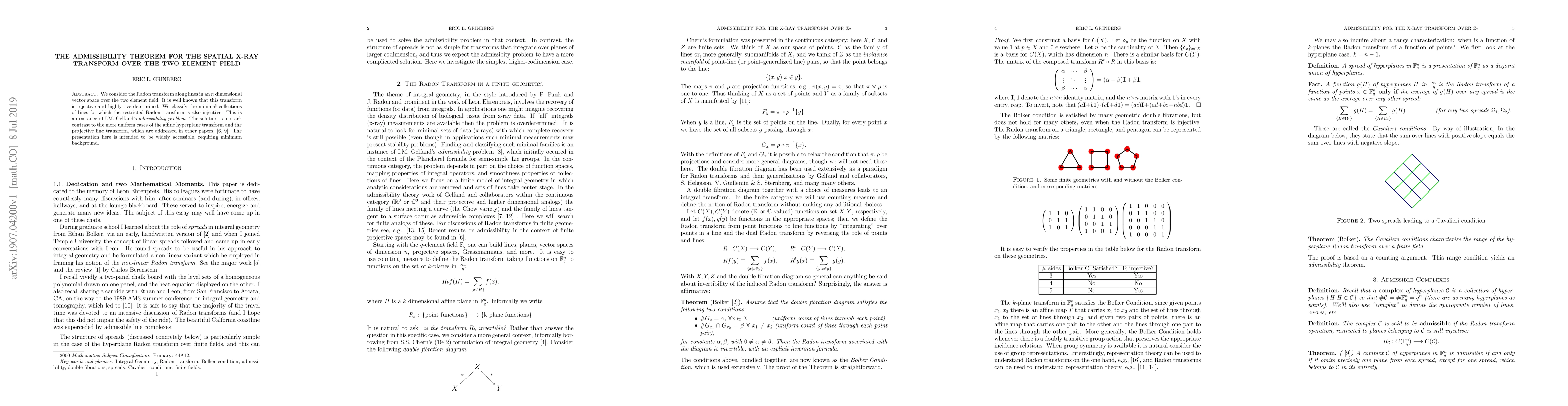 We consider the Radon transform along lines in an $n$ dimensional vector space over the two element field. It is well known that this transform is injective and highly overdetermined. We classify the minimal collections of lines for which the restricted Radon transform is also injective. This is an instance of I.M.~Gelfand's {\it admissibility problem}. The solution is in stark contrast to the more uniform cases of the affine hyperplane transform and the projective line transform, which are addressed in other papers, \cite{Feld-G,Gr1}. The presentation here is intended to be widely accessible, requiring minimum background.