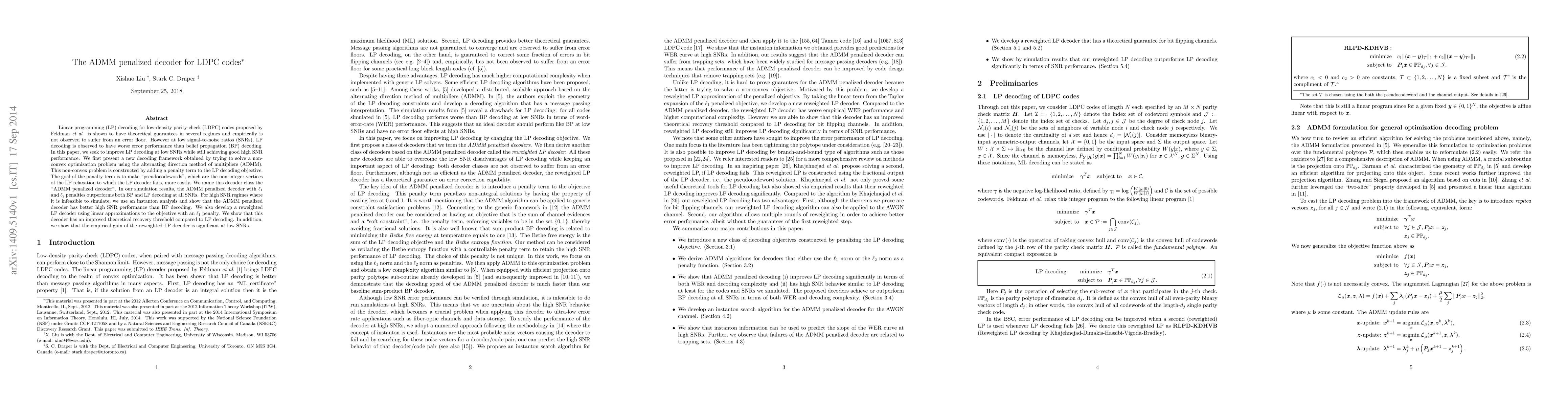 This paper proposes an ADMM penalized decoder for LDPC codes, which improves upon linear programming decoding by adding a penalty term to address poor performance at low SNRs. The ADMM penalized decoder, along with a reweighted LP decoder, outperforms belief propagation and linear programming decoding across all SNRs, demonstrating better high SNR performance and a significant empirical gain at low SNRs.
