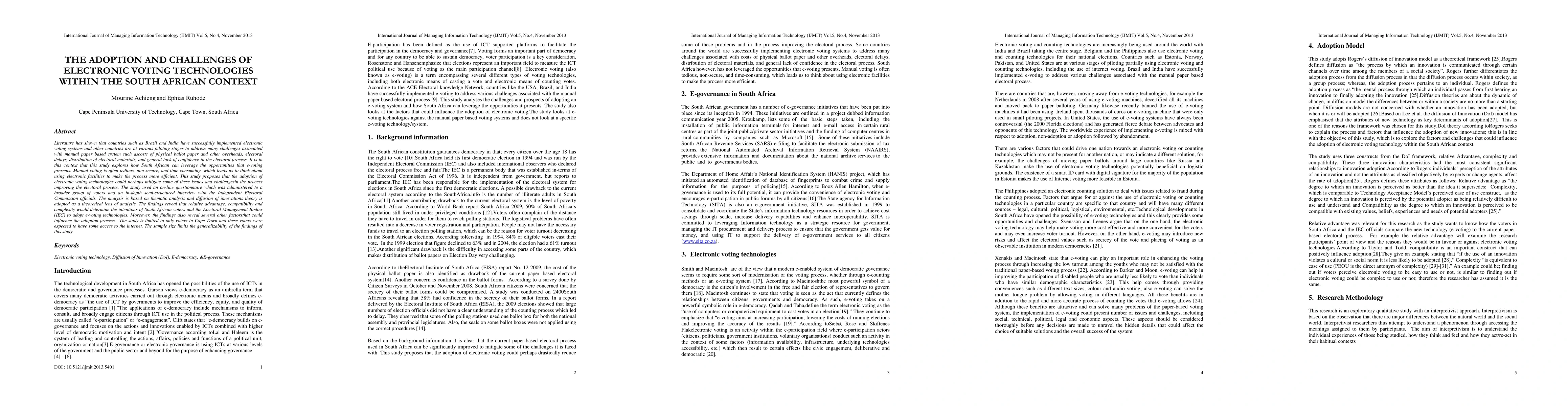This study examines the potential adoption and challenges of electronic voting technologies in South Africa, drawing on experiences from Brazil and India. Findings suggest that factors like relative advantage, compatibility, and complexity influence voter and electoral body intentions to adopt e-voting, though the study's limited scope in Cape Town restricts generalizability.