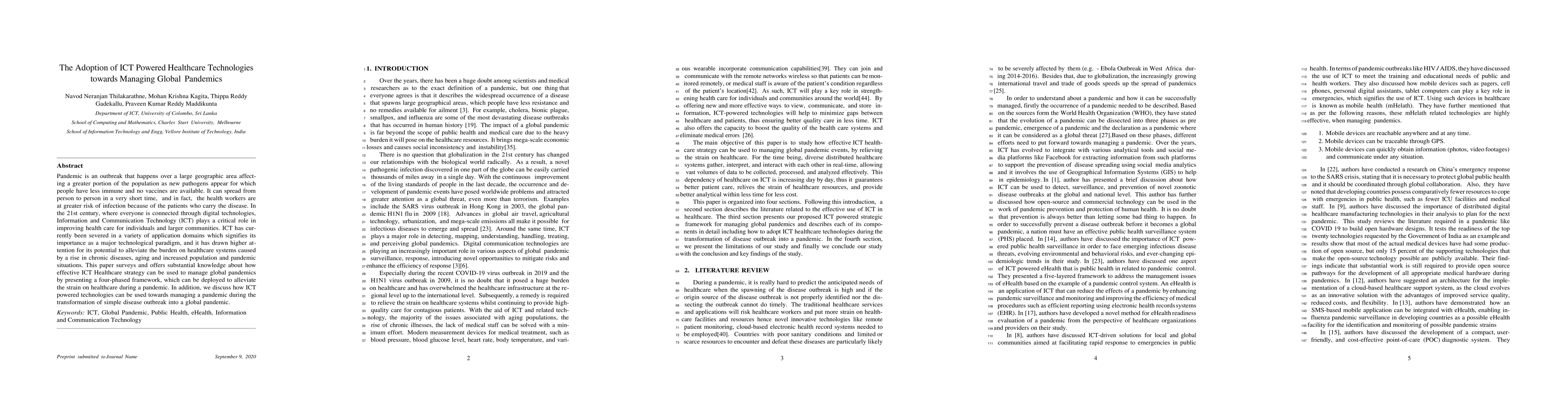Pandemic is an outbreak that happens over a large geographic area affecting a greater portion of the population as new pathogens appear for which people have less immune and no vaccines are available. It can spread from person to person in a very short time, and in fact, the health workers are at greater risk of infection because of the patients who carry the disease. In the 21st century, where everyone is connected through digital technologies, Information and Communication Technology (ICT) plays a critical role in improving health care for individuals and larger communities. ICT has currently been severed in a variety of application domains which signifies its importance as a major technological paradigm, and it has drawn higher attention for its potential to alleviate the burden on healthcare systems caused by a rise in chronic diseases, aging and increased population and pandemic situations. This paper surveys and offers substantial knowledge about how effective ICT Healthcare strategy can be used to manage global pandemics by presenting a four-phased framework, which can be deployed to alleviate the strain on healthcare during a pandemic. In addition, we discuss how ICT powered technologies can be used towards managing a pandemic during the transformation of simple disease outbreak into a global pandemic.