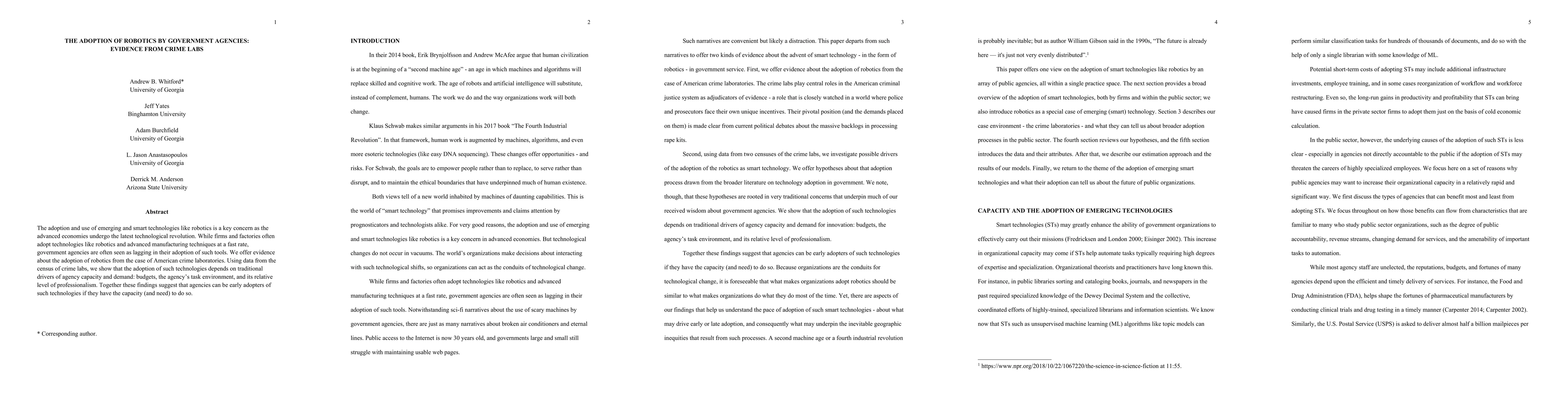 Summary: This paper investigates the adoption of robotics in American crime laboratories, providing evidence that government agencies can effectively integrate advanced technologies, challenging the perception of their slower technological adoption compared to private firms.