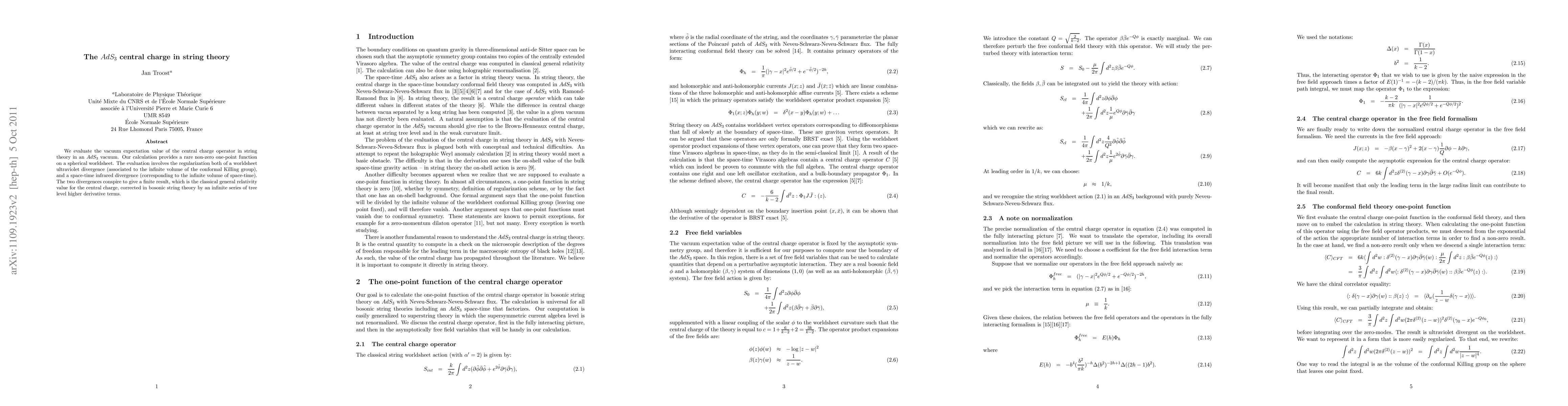 Researchers evaluated the central charge operator in string theory on an AdS3 vacuum, finding a non-zero one-point function that matches the classical general relativity value after regularization of divergences.