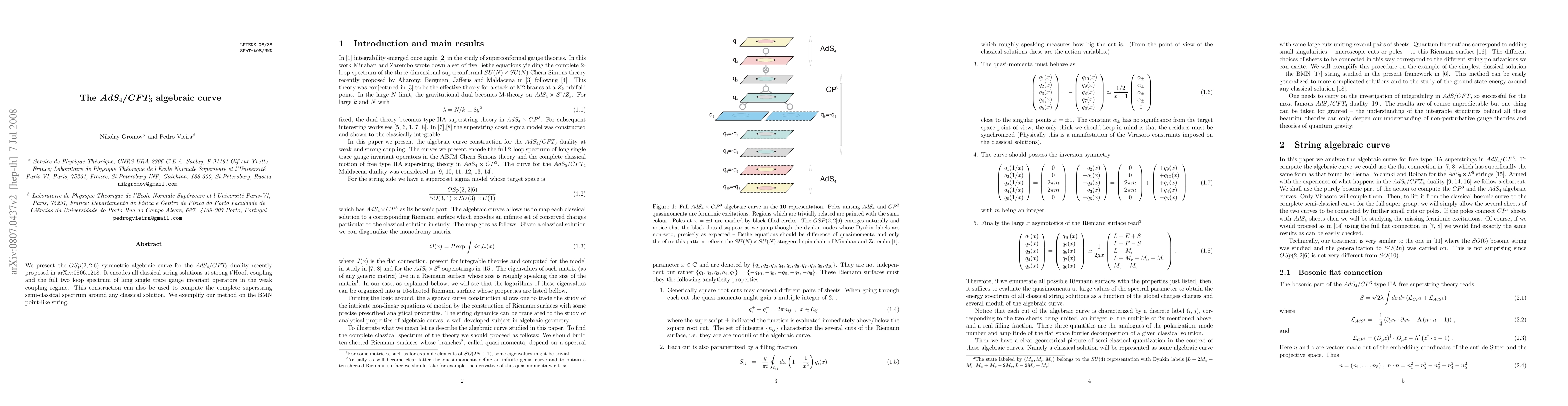 This paper introduces an OSp(2,2|6) symmetric algebraic curve that encapsulates the AdS4/CFT3 duality, providing a framework to describe classical string solutions at strong coupling and the two-loop spectrum of gauge-invariant operators at weak coupling. The method is demonstrated through the BMN point-like string.